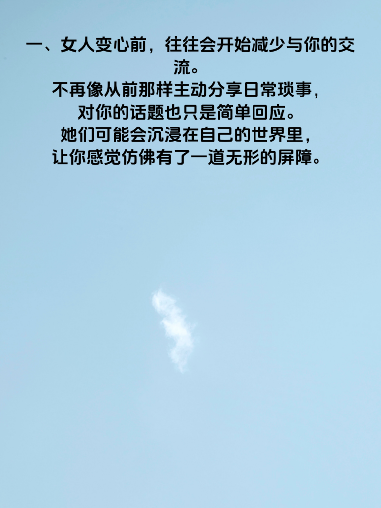 一、女人变心前,往往会开始减少与你的交流。不再像从前那样主动分享日常琐事,对你的话题也只是简单回应。她们可能会沉浸在自己的世界里,让你感觉仿佛有了一道无形的屏障。 二、对你的态度也会发生变化。曾经的温柔体贴逐渐消失,取而代之的是不耐烦或者冷漠。你精心准备的约会,她可能不再期待,甚至找借口推脱。 三、在生活细节上,也能看出端倪。比如,她不再关心你的喜好,不再为你准备贴心的小惊喜。你们之间的纪念日、生日等重要日子,她也不再用心对待。 四、社交方面,她开始有意无意地避开你。总是有各种理由和朋友出去,而不愿意和你一起度过时光。甚至在你面前接打神秘电话,对手机信息格外在意。 五、身体接触也会变得不那么自然。曾经亲密的牵手、拥抱,现在可能会让她觉得不自在,下意识地躲开。如果出现这些行为,或许就需要你认真审视这段感情了。