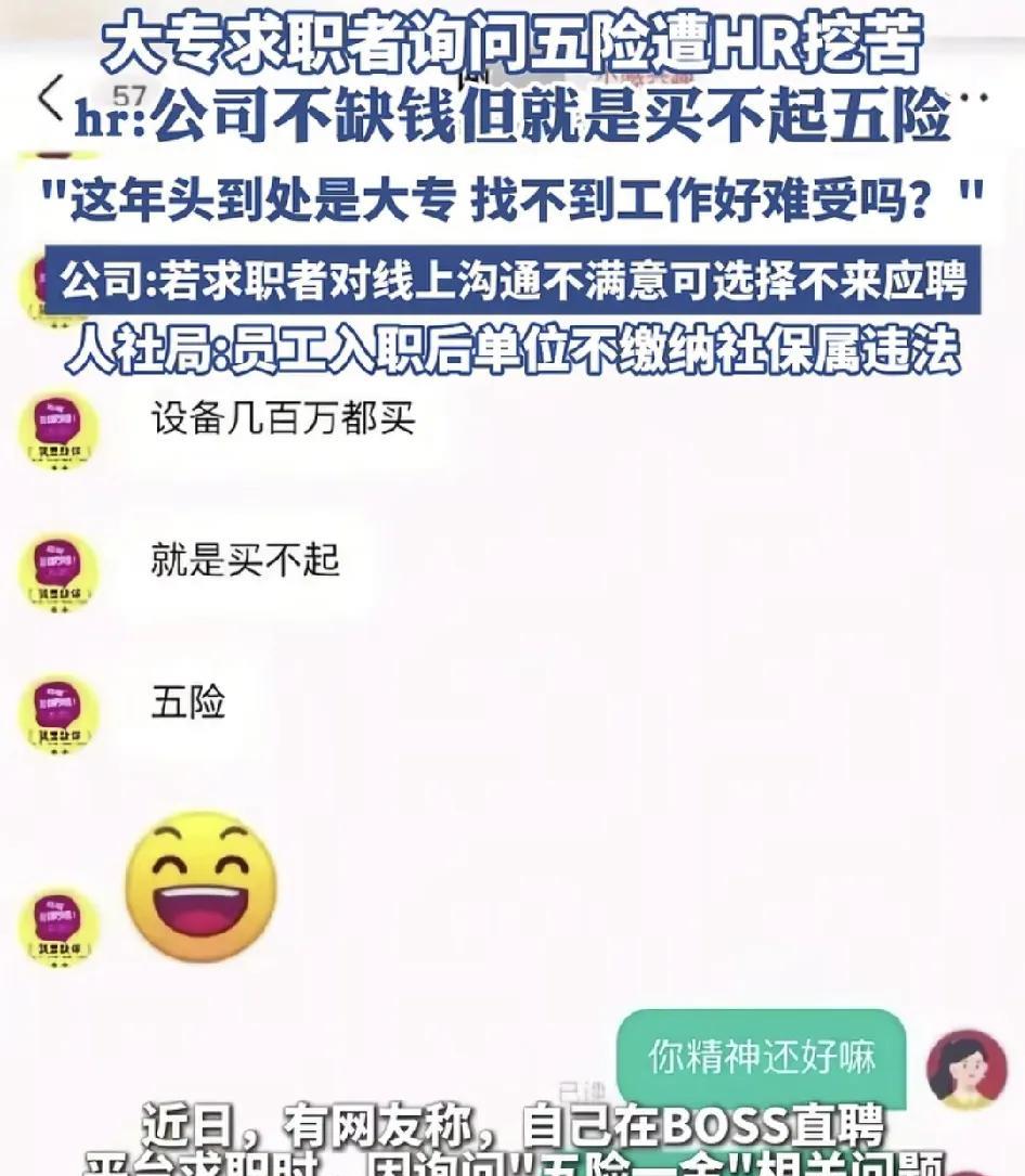 网友在某招聘网上应聘,求职时当问到对方公司是否缴纳五险一金的时候被对方言语挖苦。对方陈公司有钱,但是买不起五险,并且表示现在社会环境到处都是大专的。学生找不到工作由爸妈来养活,公司方面还回应。如果在线上应聘过程中不满意,可以选择不到公司来应聘。这样的公司一看就是人员素质非常的低。即便可以去就职,相信人事关系也不怎么样。公司可以筛选更高学历的人才,但是最基本的数字必须要有。