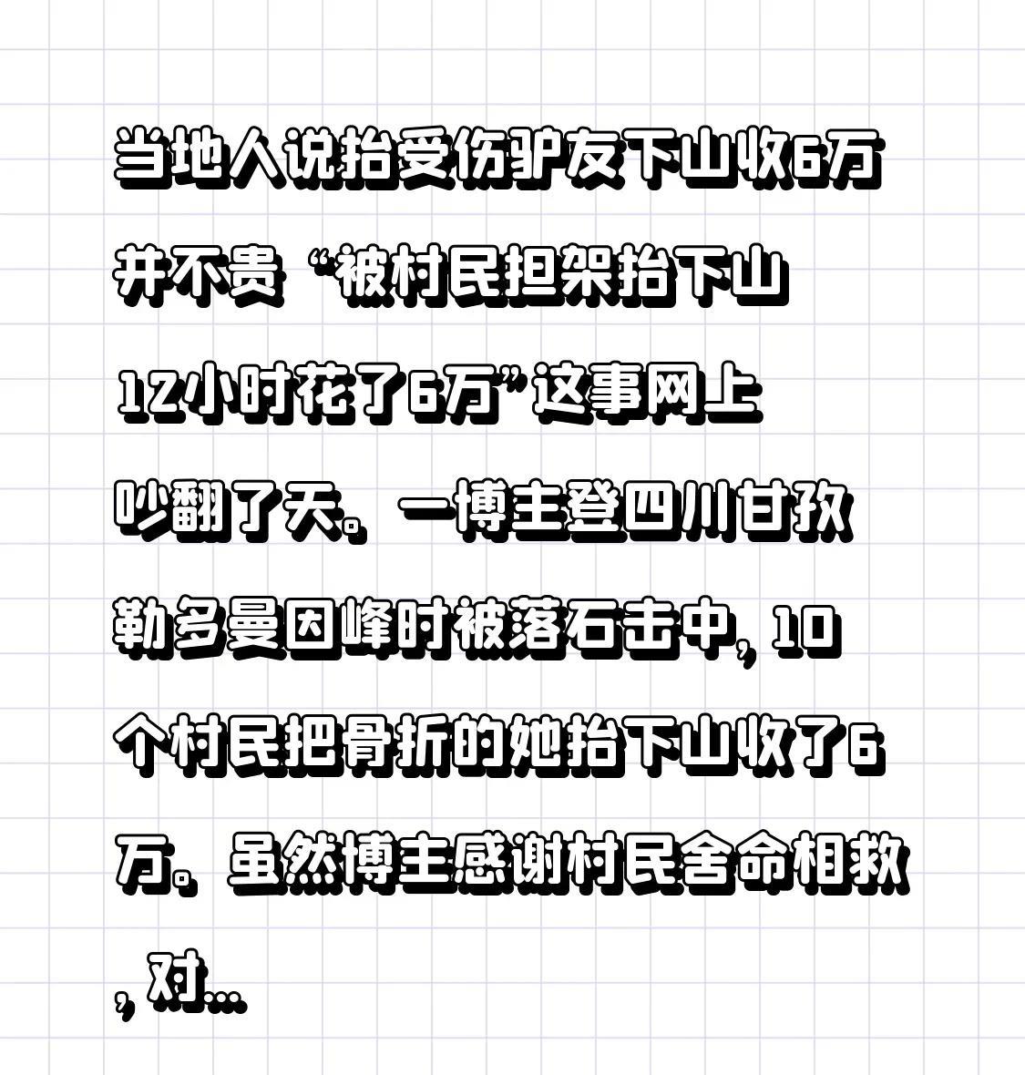 当地人说抬受伤驴友下山收6万并不贵 当地人称抬受伤驴友下山收6万并不贵,“被村民担架抬下山12小时花了6万”这件事在网上闹得沸沸扬扬。有一位博主在攀登四川甘孜勒多曼因峰的时候,被落石击中了,10个村民把骨折的她抬下了山,收取了6万。尽管博主很感激村民不顾性命地搭救自己,对这个价格也没有意见,可是很多网友却觉得这是趁人之危。 四川省登山户外运动协会的会长表示,在雪山上抬人是非常不容易的,并没有一个统一的标准,全靠双方去协商价格。要晓得,博主受伤之后情况特别危急,她的朋友把她拖行到安全的地方,多次求救都没有结果,最后联系了马帮,人家还冒着落石的危险赶过来。村民也是在拿自己的性命救人啊,6万可能真的不算贵。 #藏民抬驴友# #珠峰入山费# #驴友索赔# #旅游抬轿价格#
