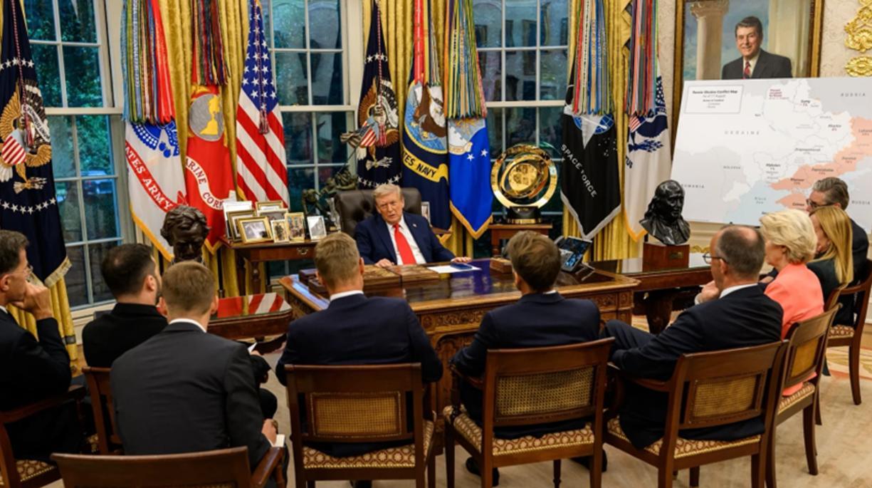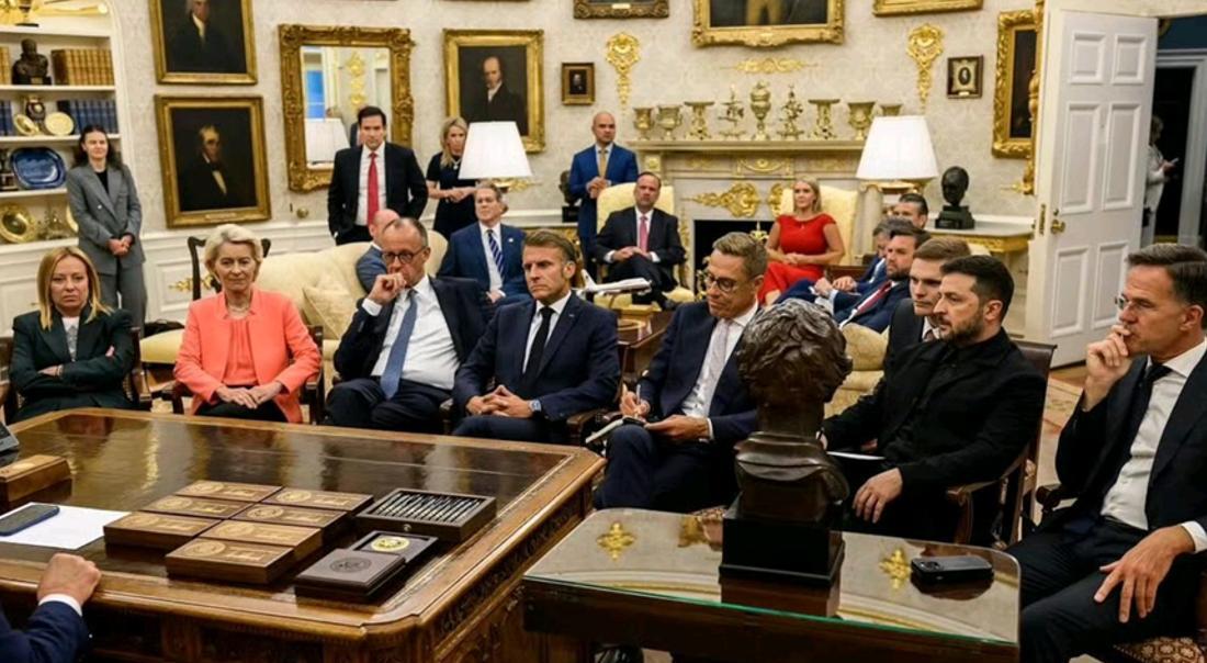 在和泽连斯基会晤后,特朗普就马上让欧洲7个领导人进来,再加上泽连斯基,开了个扩大