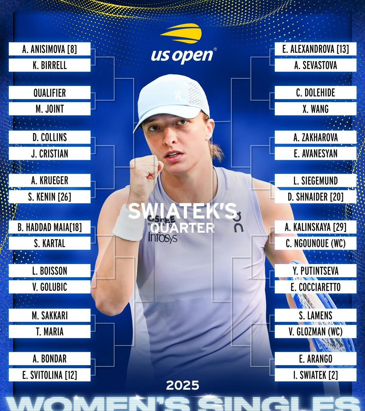 #美网2025# 女单签表,前八种子对位。 [1]萨巴伦卡 - [7]鲍里妮 [4]佩古拉 - [5]米拉·安德列娃 (6)凯斯 - [3]高芙 [8]阿尼西莫娃 - [2]斯瓦泰克 中国球员首轮对阵: 袁悦 vs [17]萨姆索诺娃 王雅繁 vs [10]纳瓦罗 朱琳 vs 波塔波娃 王欣瑜 vs 多勒海德