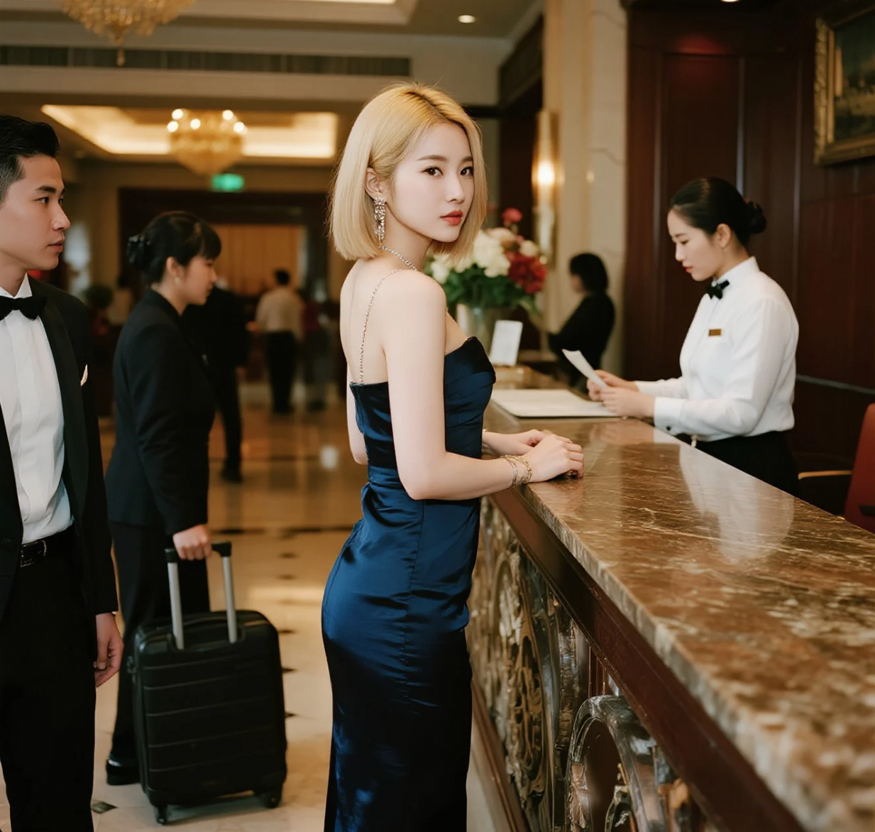 行李箱轮子还在转,她已成了酒店前台最美的“装饰画”