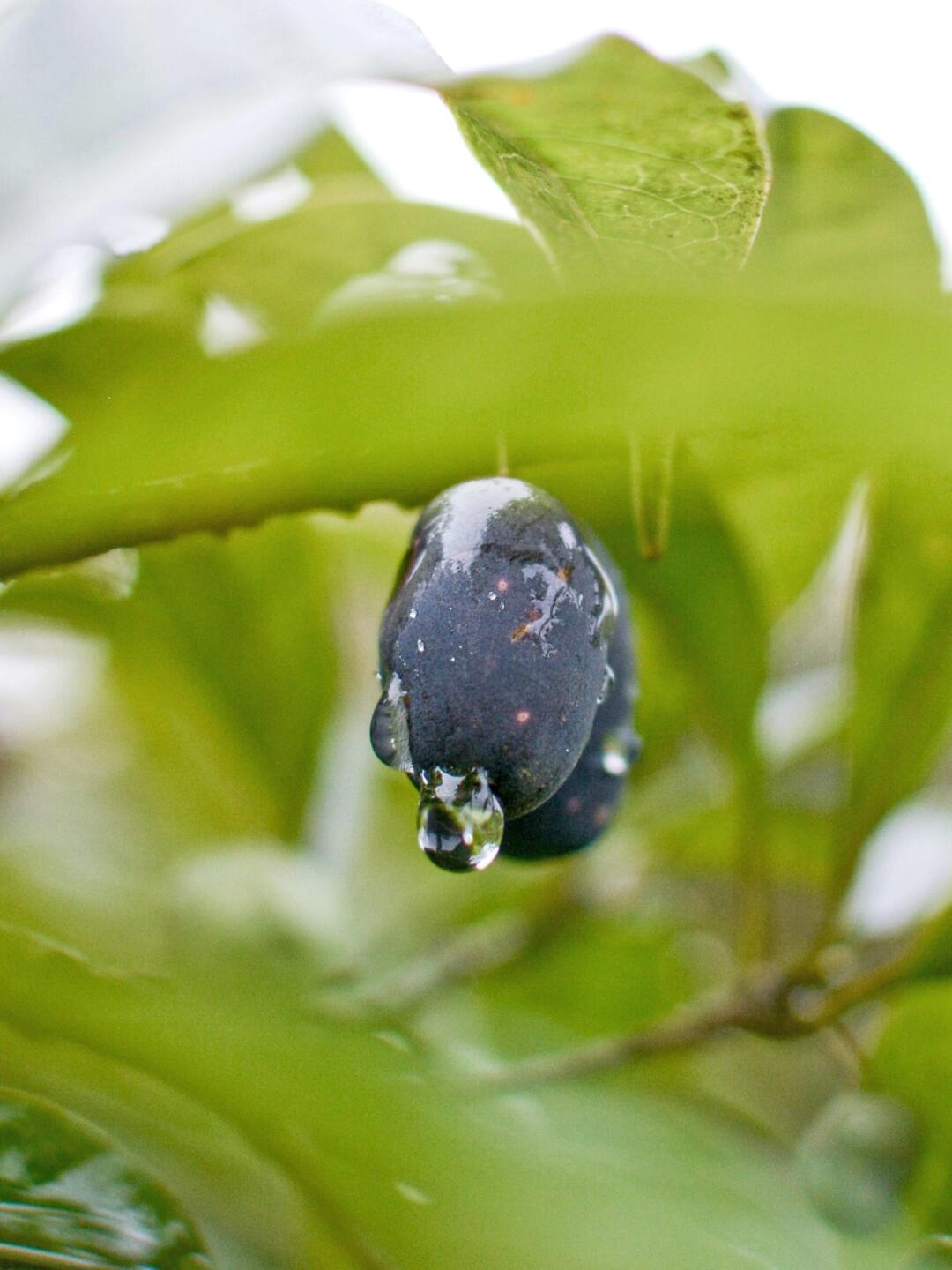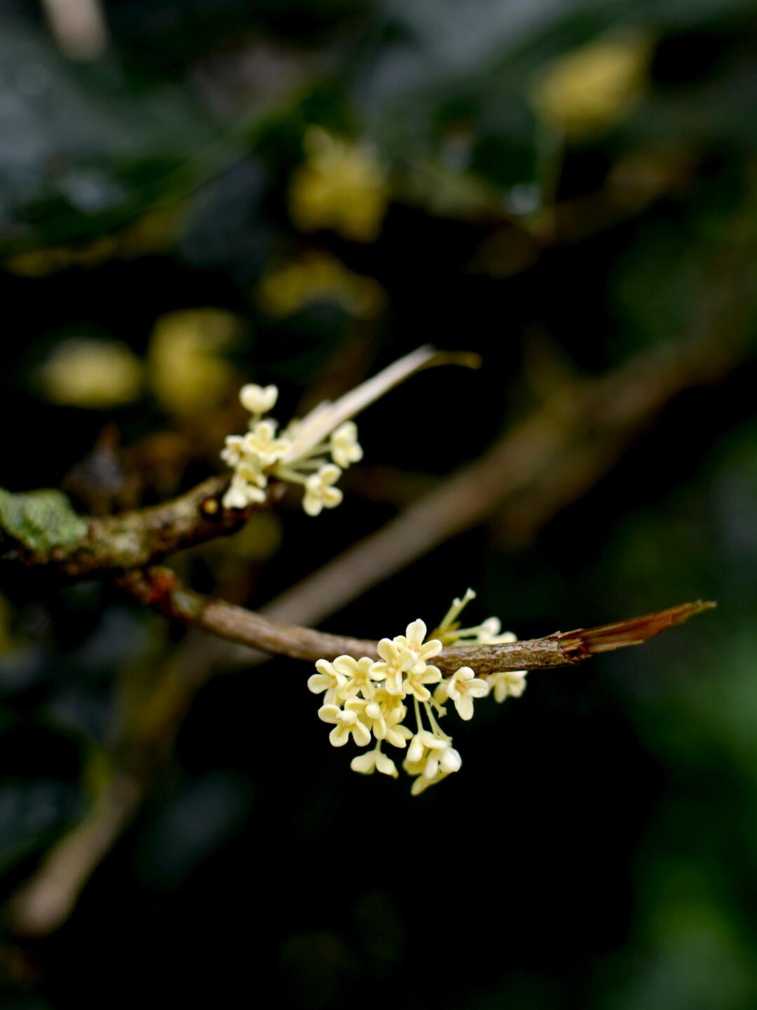 桂花在植物学上的中文正名叫“木樨”。桂花树有两种,一种开雄花,不结果;一种开两性花 ,结果。两种桂花都是簇生,花冠都是四深裂,区别在花心。雄花可见两枚雄蕊,雌蕊则退化成一个尖头或小叶状。两性花则有完整的雄蕊与雌蕊,可以清楚的看到花心里绿色的子房与浅黄色的柱头。这些圆柱形的小子房,来年春天会结出紫黑色的果实,即桂子(图6)。