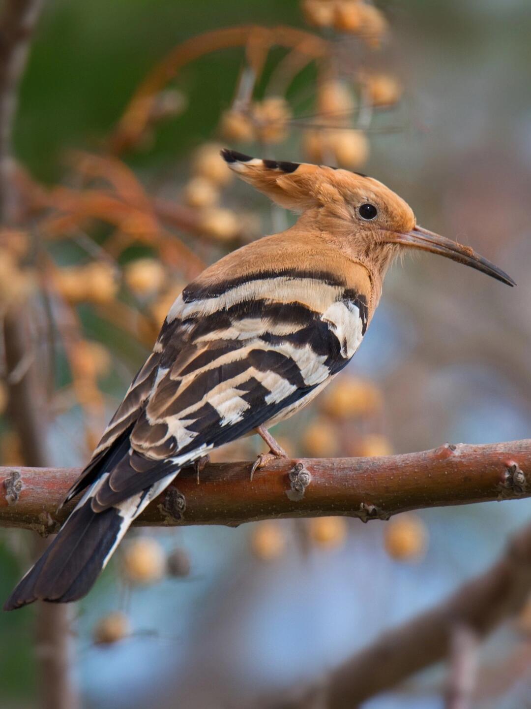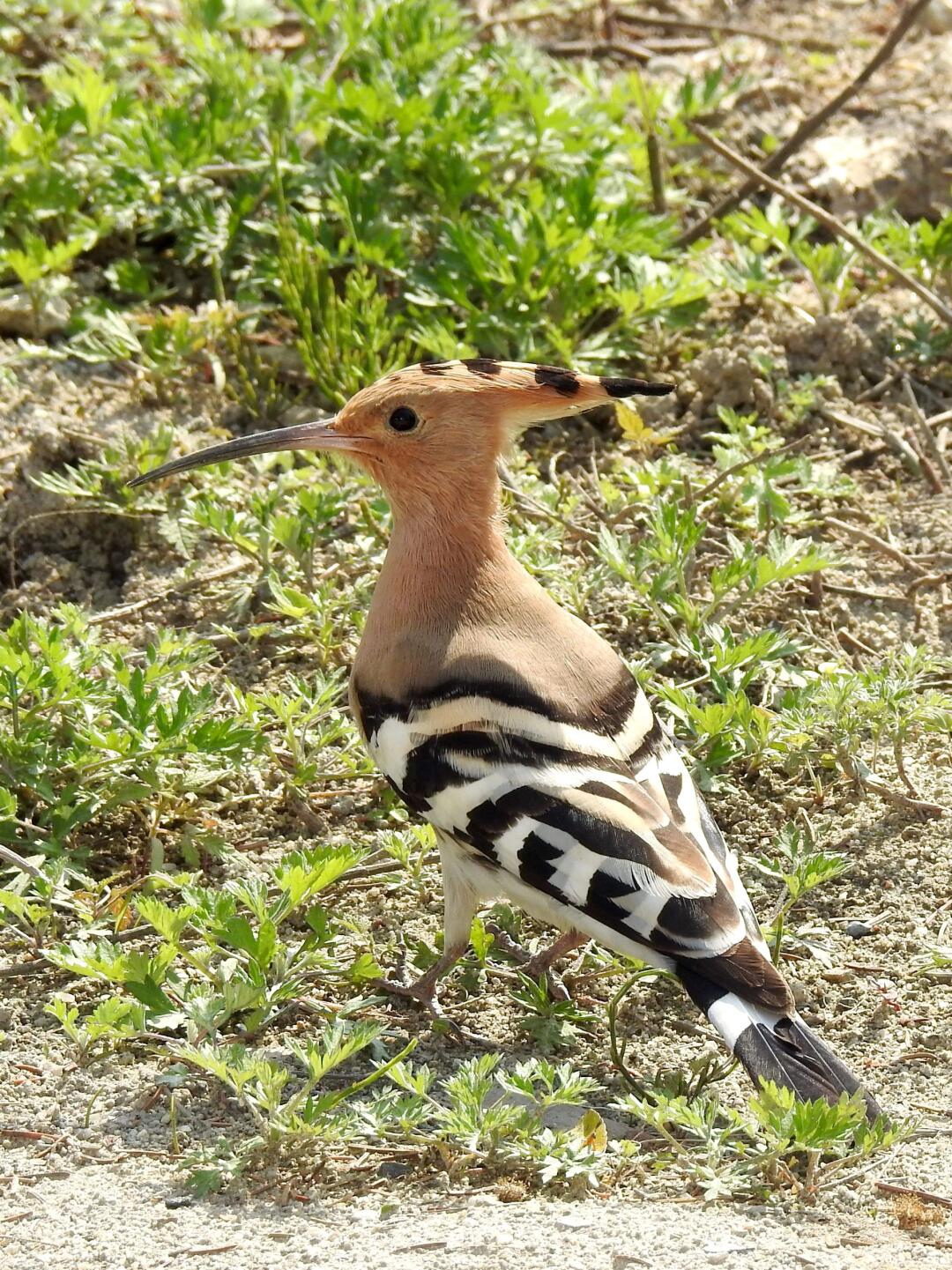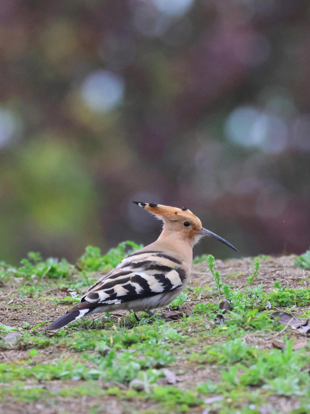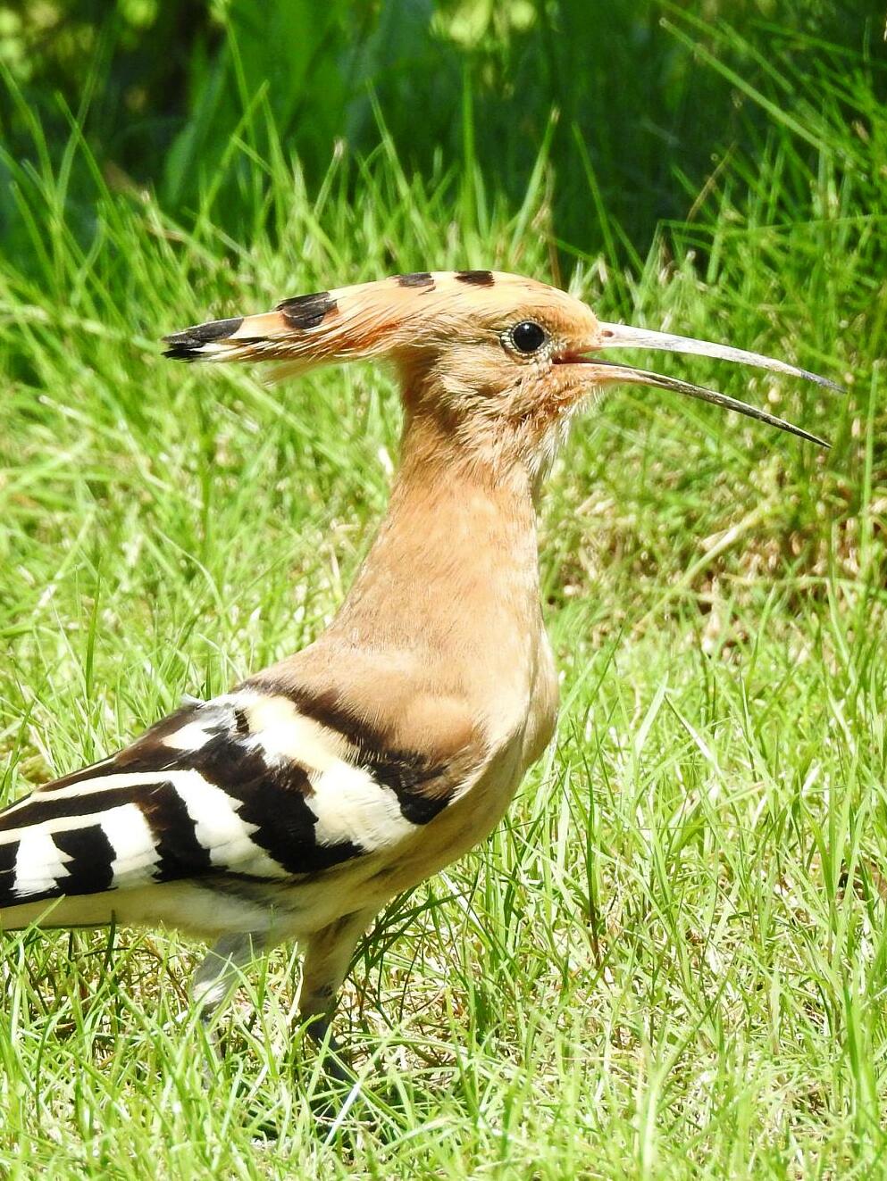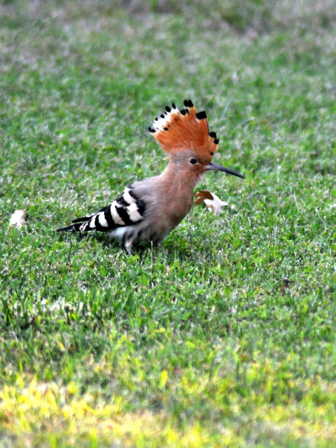 注意观察公园空旷的草坪,也许能看到一只符合上面外形描述的鸟,在地面慢慢地走,边走边点头,时不时停下用嘴在地面翻动寻找食物。它就是戴胜啦~