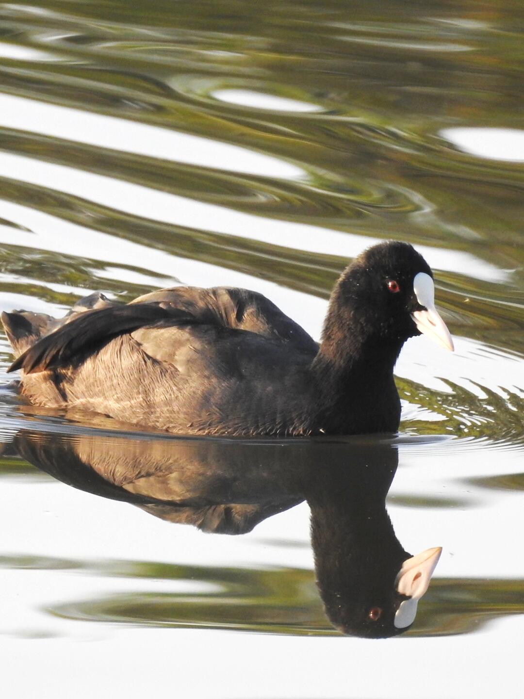 远看容易认成黑水鸡,不过看看白色的嘴,就可以确定是骨顶鸡了。它们擅长游泳和潜水,一天的大部分时间都在水中。遇到危险,会潜入水中,或是进入旁边的芦苇和水草丛中躲避。