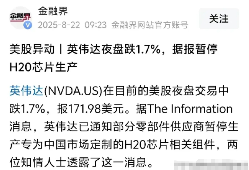 H20停产,怪谁呢? 英伟达因为我们拒绝购买阉割版产品,已经停止生产这个我国专供的产品。 想当初,那些跃跃欲试准备大肆收购的企业可以明白了。 这个H20特供版,真的只是针对我国,世界上其它国家和地区根本就没有市场。 是不是垃圾不知道,但既然停产了,就说明有问题。 至于这个结果怪谁呢?只能说黄想的太天真,却忘了世事无常。
