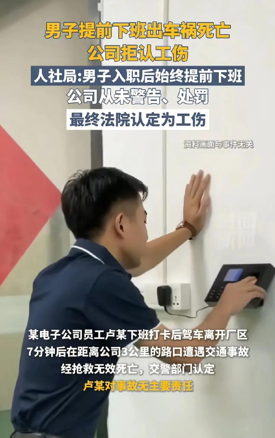 江西,男子入职公司后,经常提前下班,每次都是17点50分到18点这样打卡。公司从未警告和处罚。谁知,男子这次又提前7分钟下班,他开车回去的路上,发生交通事故,不幸去世,男子的家属认为这是工伤,要求公司赔偿,但公司却以早退为由拒绝。家属一纸诉状将公司告上法院,法院的判决亮了。 封面新闻报道,卢某在一家公司工作,经常在未到下班时间时就提前离开。 公司一直并未对此提出异议。然而,卢某早退后发生事故,公司却开始找理由推脱责任。 卢某于2023年2月入职某电子公司,公司规定的下班时间为18时。 自入职以来,卢某半年内的下班打卡记录始终稳定在17时50分至18时之间,公司在此期间从未对卢某的提前下班行为提出过警告或处罚。 由于没有人阻止,人事的考勤也没有异议,卢某也习以为常了。 早退这行为在很多公司是不允许的,因为很多公司都是按考勤制度上下班,就是不知道公司为什么没有考勤处罚。 2023年8月23日17时53分,卢某下班打卡后驾车离开公司厂区,7分钟后在距离公司3公里的路口遭遇交通事故,经抢救无效死亡。 交警部门认定,卢某对事故无主要责任。 卢某的家属在得知这一晴天霹雳的噩耗后,悲痛欲绝。 他们难以接受这个残酷的事实,泪如雨下,忍受着白发人送黑发人的巨大痛苦。 卢某家属认为,卢某在上班时间发生车祸,那就是属于工伤,向公司索要赔偿。随即向当地人社局申请工伤认定。 但公司提出异议,认为卢某下午5时53分离开属于私自早退,不算正常上下班,是不属于工伤,拒绝卢某家属的索赔要求。 不料,人社局调查发现卢某的下班时间已形成企业默许的惯例,根据相关规定,最终认定卢某为因工死亡。 公司不服,提起诉讼,要求人社局撤销工伤认定,但一审、二审均维持了人社局的工伤认定结论。 有网友就说,公司长期对违规行为不闻不问,员工天天早退,都已经让他们成了不成文的文件,会让员工认为公司管理松懈,真是该管的不管。现在出事了,也是公司默许的,就要承担后果,没毛病。 有网友表示:到底是什么样的公司,考勤制度能如此松散,员工长期提前早退,竟无人过问?我同事上班摸鱼,我跟人事反映,人事却不了了之,反而还把我解雇了。 看来,公司真的好好管理一下考勤和上班制度了,有的人提前早退,都不用处罚和警告,那公司其他员工怎么想?是不是也觉得很不公平。 那么法院为什么支持工伤认定呢? 《人力资源社会保障部关于执行〈工伤保险条例〉若干问题的意见(二)》第6条规定:职工以上下班为目的、在合理时间内往返于工作单位和居住地之间的合理路线,视为上下班途中。 “合理时间”包括单位规定时间、加班延后时间,以及单位长期默许形成的弹性时段。 法院认为,尽管公司规定18时下班,但卢某自2023年2月入职至事故发生时,长达半年的打卡记录显示,实际下班时间大都集中在17时50分至18时之间,公司从未进行管理干预,形成了默许惯例。因此,17时53分属于“合理时间”范围内。 《最高人民法院关于审理工伤保险行政案件若干问题的规定》第6条规定:对社会保险行政部门认定下列情形为“上下班途中”的,人民法院应予支持: 在合理时间内往返于工作地与住所地、经常居住地、单位宿舍的合理路线的上下班途中。 在合理时间内往返于工作地与配偶、父母、子女居住地的合理路线的上下班途中。 从事属于日常工作生活所需要的活动,且在合理时间和合理路线的上下班途中。 在合理时间内其他合理路线的上下班途中。 《企业职工工伤保险试行办法》第8条规定:职工上下班途中遇到交通事故的可认定为工伤,但须同时具备以下条件: 必须是在上下班的规定时间发生的交通事故;必须是在上下班的必经线路上发生的交通事故;必须是本人没有责任或者不是主要责任;必须是因机动车而引起的道路交通事故。 卢某的事故地点在公司与住所之间的必经线路上,交警部门认定卢某对事故无主要责任,卢某的事故是由机动车引起的道路交通事故,全部符合这3个条件。 最终,法院认定卢某的死亡属于因工死亡,应当认定为工伤。 对此,你怎么看? #头号创作者激励计划#