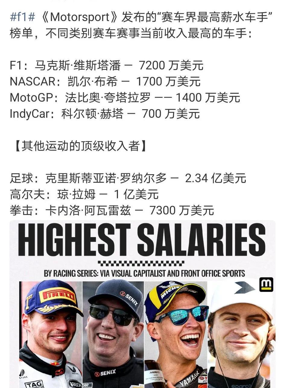 车比人贵!车手的年薪竟然如此之低…… 赛车界最高薪水车手榜单,不同类别赛车赛事当前收入最高的车手。 F1年薪最高的维斯塔潘7200万美元,Indycar年薪最高的赫塔只有700万美元。 NBA随便一个巨星都有5、6千万年薪。
