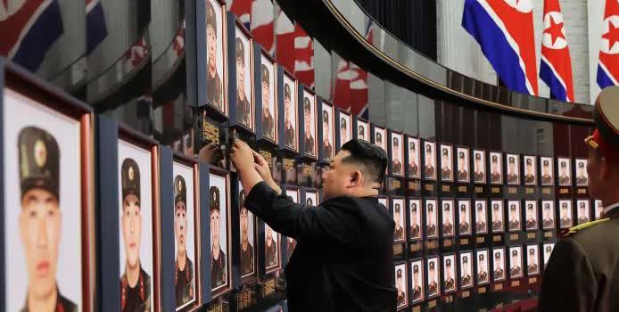 金正恩下跪,悼念100多名阵亡朝鲜士兵。 据朝中社今天(22日)刚刚披露的消息,朝鲜领导人金正恩主持了在援助俄罗斯对乌克兰战争中阵亡的朝鲜指挥官和士兵的追悼会,首次证实有超过100名士兵在战争中阵亡。画面中可以看到,金正恩单膝下跪整理阵亡朝鲜士兵的遗像(图一),而这些遗像布满背景墙,整整有101个(图二)。 值得一提的是,这是朝鲜方面首次举行此类仪式。据朝中社报道,金正恩在仪式上发表的讲话中赞扬了本周返回平壤的部队,称他们是“为国家带来荣耀的英雄”。 当天,金正恩授予了参加战斗的朝鲜人民军指挥员和士兵“人民共和国英雄”称号。
