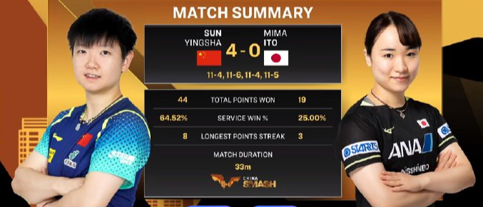 尽管最后第三局还是输了,但警觉起来的孙颖莎在接下来的两局比赛中,并没有给伊藤美诚太多机会,11-3,11-4,几乎算得上是轻松赢下。
