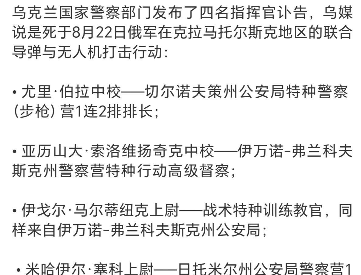 乌克兰发布四名警察阵亡消息,透着蹊跷,四人中两名中校,两名上尉。他们是死亡时间8月22日,地点是克拉马托尔斯克地区,这是顿涅茨克州的城市,但是他们不是这里的警察。也就是说他们也被送到顿涅茨克前线了。 而且波拉中校担任排长,都没听说过这组合。 由此看来乌克兰前线兵源短缺已经非常严重。再打下去,乌克兰青壮年男人快打没了。