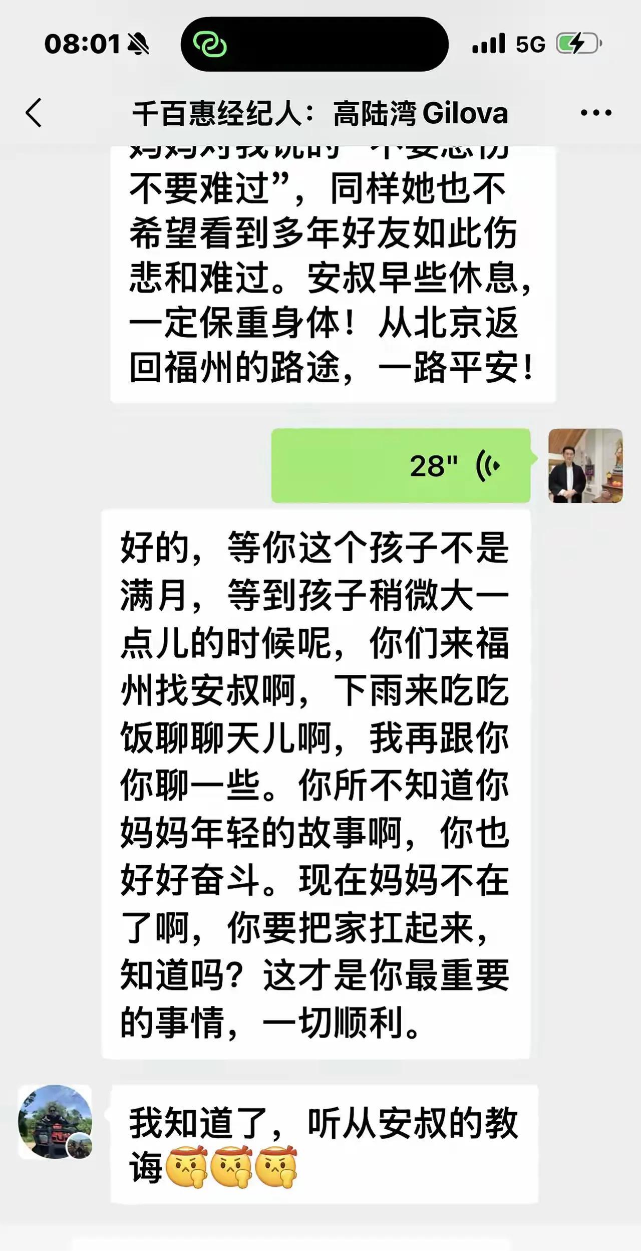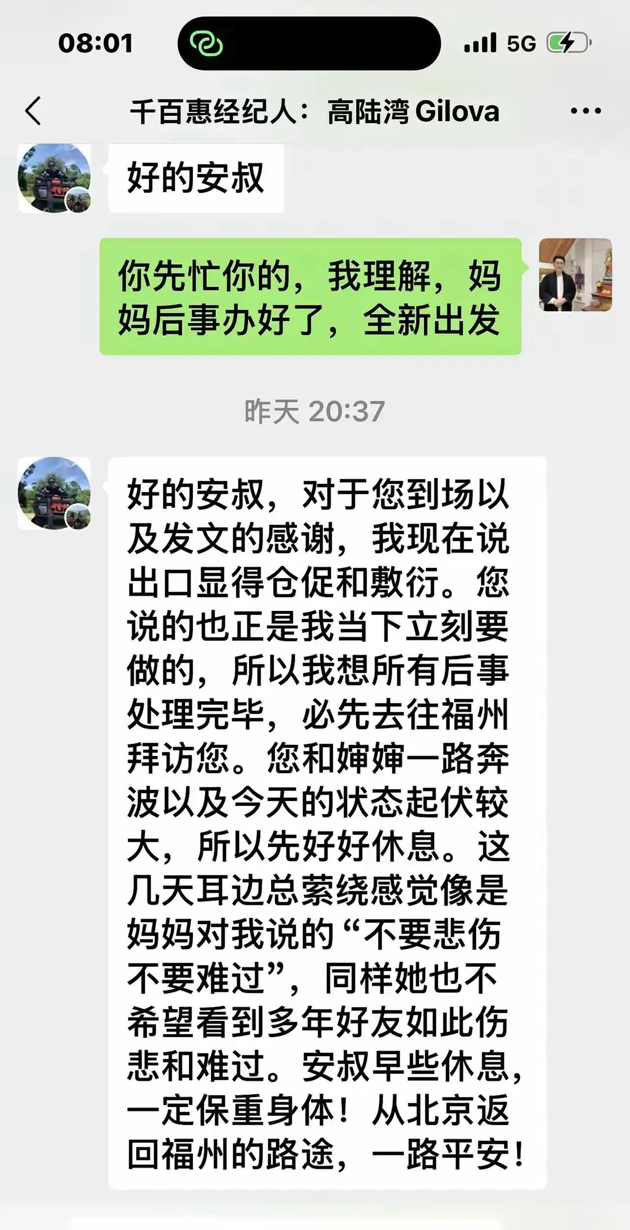 从聊天记录看千百惠的儿子高陆湾很有家教,很有素质,一定是一个孝顺的儿子,他的妈妈生前一定是幸福的!儿子懂事,可以继续妈妈留下的家业,妈妈可以放心了!安哥有情有义,值得敬重!从昨天到今天,看到所有安哥的发文,也了解了他们之间的友情。非常美好!人生贵在知遇之恩,千百惠作为黄安的同乡和同学,当年也是他的考官,一句“就你了”成就了黄安的一生,这就是最动人的伯乐故事。千百惠是照亮黄安人生的光。这份友情从青丝到白发,成为了心底最暖的念。带着这份惦念走好路,便是最好的回响。藏着多少深情啊!比起轰轰烈烈,这种笃定更动人,难怪记一辈子! 千百惠有黄安这个好友是很幸运的,他是一位重情重义的大哥,爱国爱民爱乡土的堂堂正正的中国人,不愧是很多人的偶像,安哥在追悼会现场哭成了泪人,最后时刻告别时向多年的好友嘱咐了很多话。并且在以后的日子里,会像对自己的孩子一样去关心好友的儿子,在孩子人生的至暗时刻,给予了他来自长辈的关怀和温暖,让孩子有了主心骨和靠山。很令人感动。人的一生有这样一位好友足矣。看到有那么多为千百惠送行的人,说明她的品行人品很好。生前喜欢做慈善事业,帮助贫困地区的孩子和困难群体。但愿每个人在生活中都要像千百惠和黄安一样,做一个温暖的人!