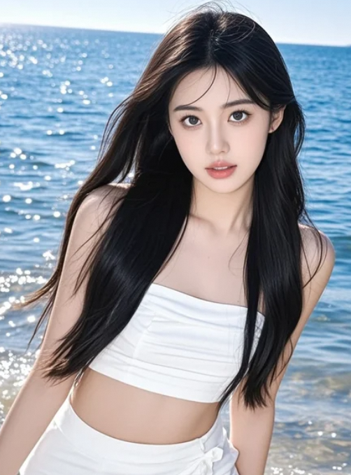 晚风中的东方倩影,长发与温柔笑容交织成动人诗行