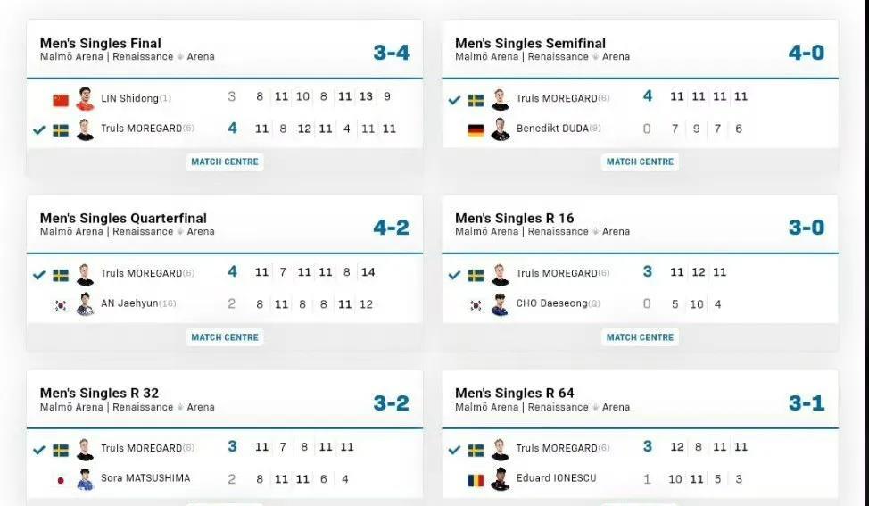 2024WTT新加坡大满贯:林诗栋3比1莫雷高德(4,9,-11,5)