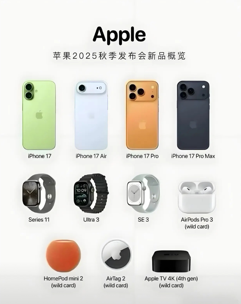 苹果2025年秋季新品发布会的产品全在这了,今年发布会是9月10号,也就剩十几天时间了,这些产品里面,热度最高的也就是iPhone17系列了。