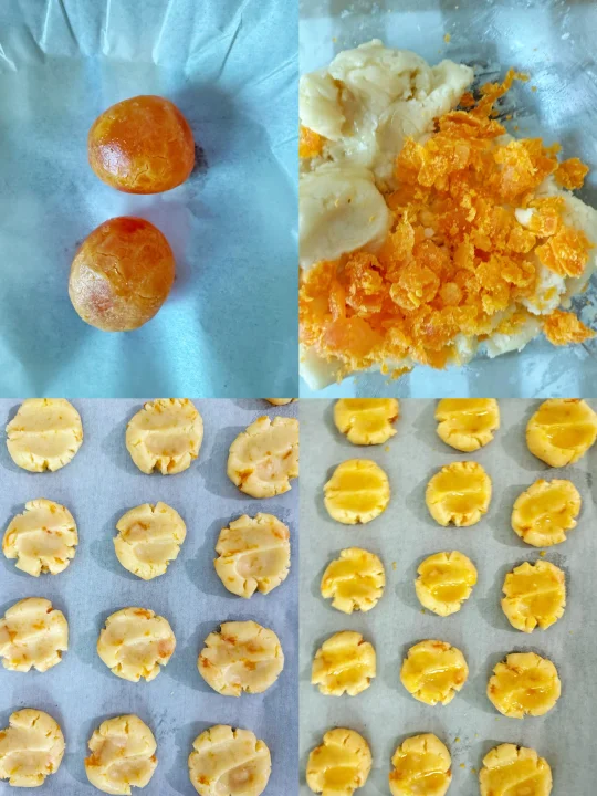 3:倒入蛋黄碎翻拌均匀,分成20g一个面团搓圆,按压放进烤盘,依次做好!