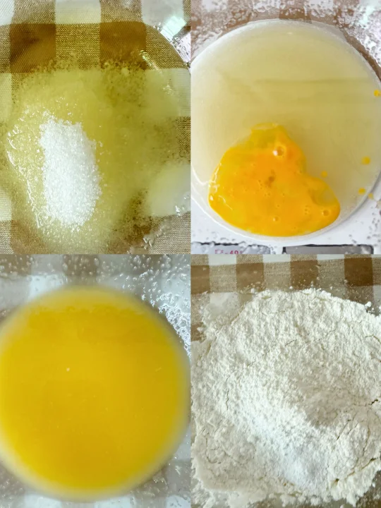 2:玉米油放白糖搅拌均匀,倒入鸡蛋液搅拌均匀,筛入低筋面粉和泡打粉翻拌均匀。