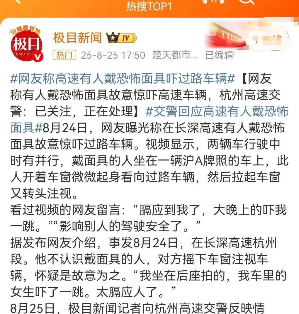 必须严惩。 竟然搞这种无聊的事情。 8月24日,长深高速杭州段,网友称高速有人戴恐怖面具吓过路车辆。 而且这人是故意的故意把窗户打开,然后看着这些车辆,有的胆子小的肯定会被吓到。 这就是一种恶趣味。#网友称高速有人戴恐怖面具吓过路车辆#