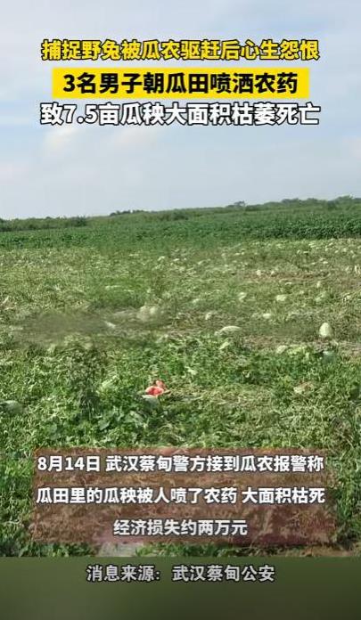 心眼太坏了!湖北武汉,3男子在瓜田里抓兔子,结果遭到了瓜农的驱赶,不料,他们竟因此心生怨恨,趁着晚上往田里撒农药,导致7.5亩的瓜秧大面积坏死,气的瓜农立即报警,而三人的下场,大块人心! 在2025年8月14号那天早上,瓜农王师傅(化名)像往常一样去巡田,却被眼前的景象惊住了——整片瓜地变成了焦黄一片。 7.5亩地里,瓜秧全都蔫了,叶子卷得死死的,藤上挂着的小西瓜也耷拉着脑袋,而且还伴随着一股刺鼻的农药味。 随后王师傅手里的锄头“咣当”一声掉在地上,他想这不是天灾,是有人故意下的毒手。 王师傅每年就是靠这一些西瓜来赚取生活费,所以他对瓜田的照顾无微不至,每天凌晨三四点就起来浇水,大太阳底下弯着腰除草,晚上还得打着手电巡田,生怕虫子闹病。 辛辛苦苦守着,就是盼着有个好收成,为了种好这7.5亩瓜,他还借了两万多块钱,买瓜苗、买肥料,这些可不是闲钱,而是指望收成之后再还债的。 然而现在这么多的西瓜全部都被毁了。 自打他看见瓜田成了那个样子之后,躺在床上翻来覆去难以入睡,于是他就想自己也没谁有仇恨,为什么有人这样害他呢? 然而他突然想起了,那天有三个年轻人在他的瓜田里面蹦来蹦去,说去要抓野兔,但因为西瓜都已经快成熟了,他们在里面跑来跑去王师傅害怕给西瓜踩了。 就将他们三人赶了出去,难道就因为这件小事就结下仇恨了?王师傅虽然觉得因为这件小事不至于但他实在是想不到还有谁与他有过节了,就报警了经警察说明了此事。 民警到场后,了解了瓜田的状况后,就调取了附近的监控,监控画面显示是一辆白色的汽车,但车牌号被人故意遮盖住,看来真的是提前预谋好的。 随后警察持续跟进调查,将他们同伙杨某以及侯某抓捕了,到了警局之后两人很快得就交代了此件事情的全过程,就是因为将他们赶出去的那件小事,他们怀恨在心。 于是应王某的想法,一起干了这件事情,不久之后王某也自己来到了警局自首,最后,他们三人因涉嫌故意破坏生产经营罪被刑事拘留,此外还要赔偿王师傅两万元的损失。 但赔偿只能弥补部分物质损失,王师傅几个月的辛苦和全家对收成的盼望,已经彻底落空。 对此,你还有什么看法呢?