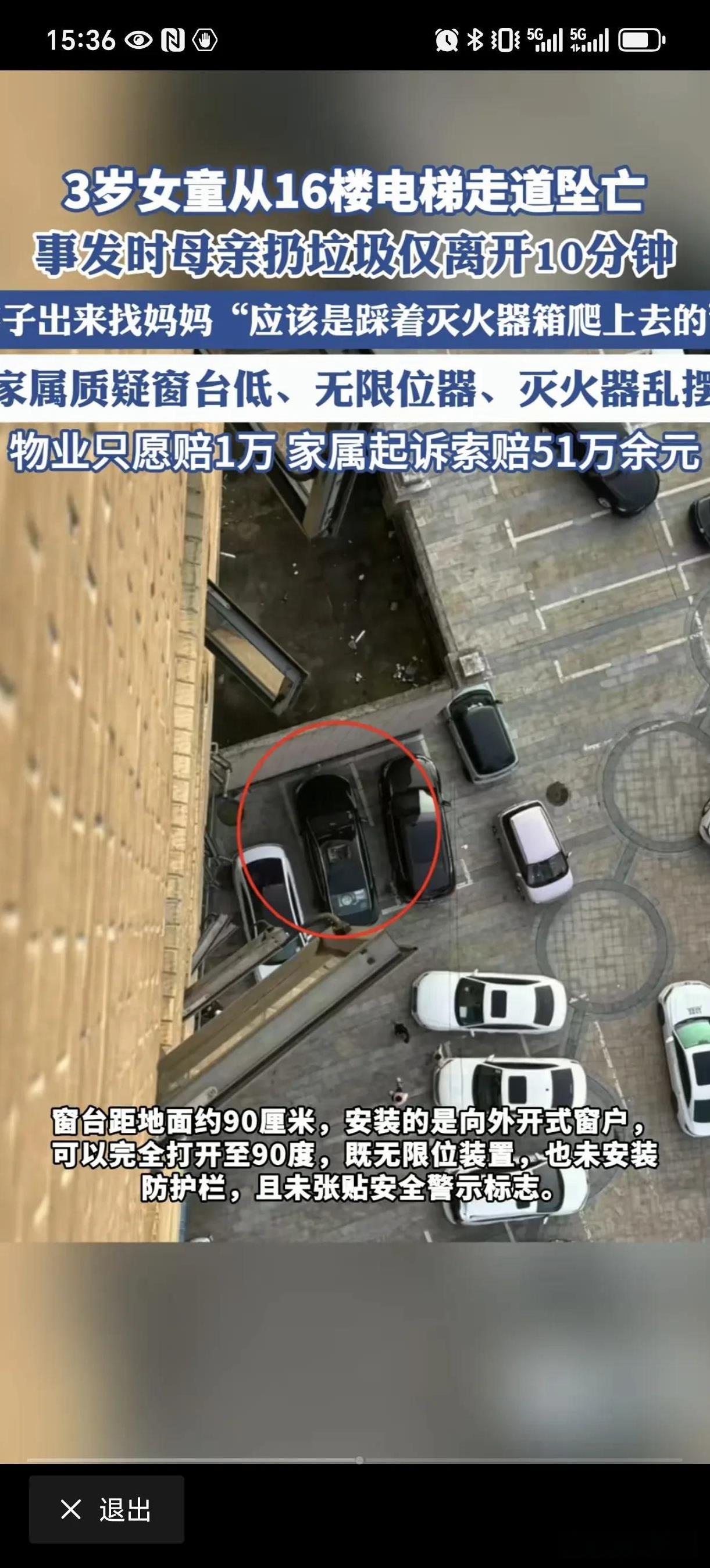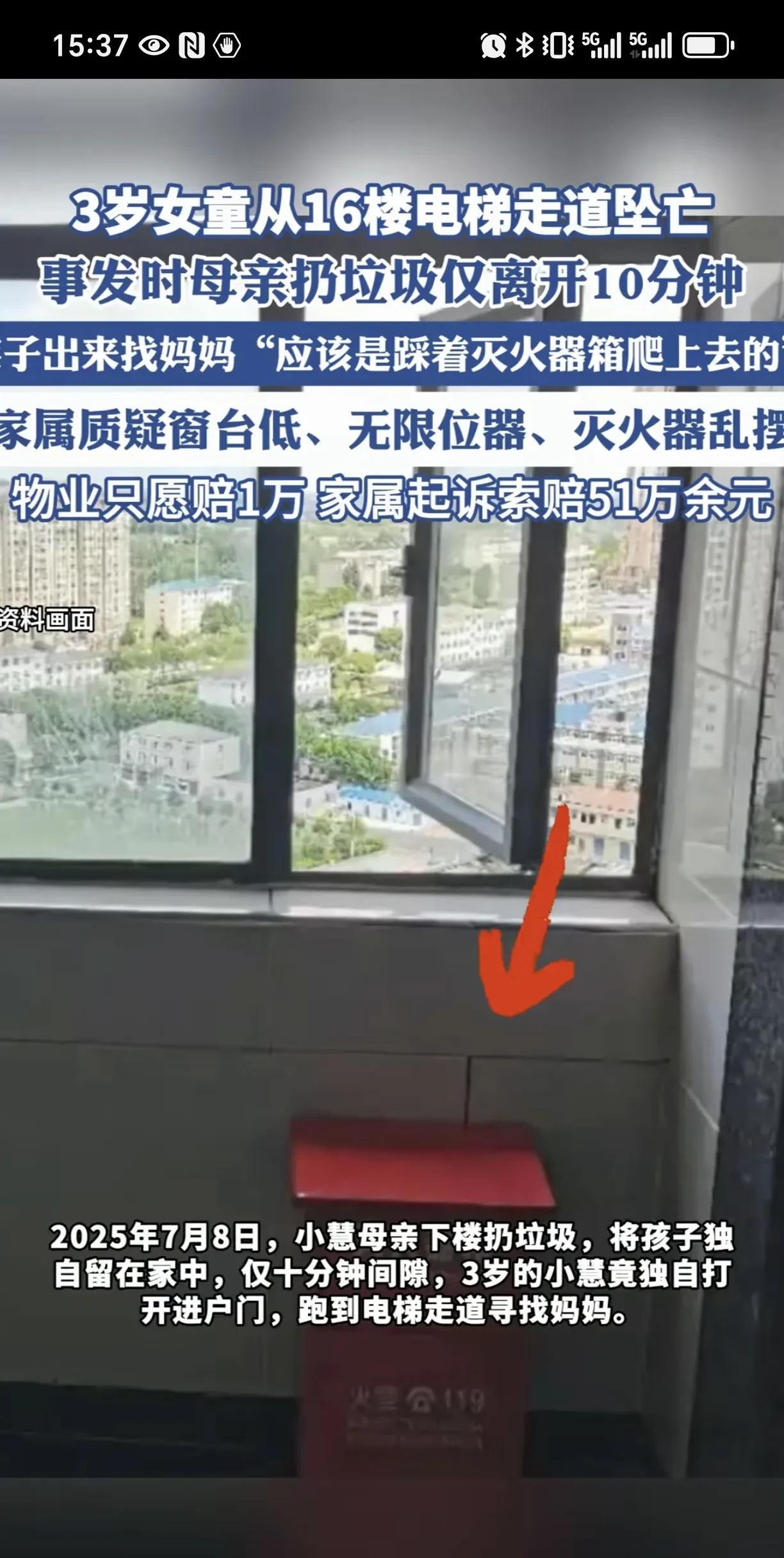 湖北孝昌,女子下楼扔垃圾,将3岁女儿独留在家中,不料,女儿找妈妈,打开门来到电梯走廊,不幸从16楼窗台坠楼身亡,而女儿马上要读幼儿园,已经买好了小书包和文具。家属悲痛之余,发现走廊处窗台低矮、窗户能完全推开,而正下方还摆着一个方便攀爬的灭火器箱,质疑这是物业与开发商共同埋下的安全陷阱。然而,物业仅愿支付1万元人道赔偿。无奈之下,家属将物业、开发商及设计单位告上法庭,索赔51万余元。 据海报新闻8月26日报道,2025年7月8日清晨,在某小区内,一场突如其来的悲剧撕裂了徐先生(化名)一家的幸福。 上午8时30分左右,母亲李女士(化名)见家中垃圾已满,想着只是下楼一趟,很快就能回来,便将年仅3岁的女儿小雨(化名)独自留在家中玩耍。 她怎么也不会想到,这短短的十分钟,竟然会永远的失去女儿。 小雨时年3岁,身高约92厘米,正处于充满好奇、活泼好动的年纪。 在李女士下楼后,小雨可能因寻找妈妈,自行打开了入户门,进入了16楼的电梯走道。 不一会儿,小雨不知怎么就到了窗台,还爬上去了,不幸从16楼高空坠落。 坠落时,她砸中了一楼超市门口停放车辆的车顶,巨大的声响惊动了众人。 虽经报警并紧急送医,但小雨已当场失去生命体征,永远地离开了爱她的父母。 经警方出具《非正常死亡证明》,确认这是一起意外坠楼事件,排除刑事案件可能。 让人心碎的是,小雨已经报名了幼儿园,崭新的小书包和文具还放在家里,静待着9月1日开学日的到来,而这个日子,她再也等不到了。 悲剧发生后,徐先生强忍悲痛,开始追责。 他发现,整栋楼乃至整个小区的同类窗户都存在同样的问题,低窗台、无限位器、无防护栏、无安全警示。 灭火器箱的摆放也杂乱无章,有的在窗下,有的在消防栓下,存在严重的安全管理漏洞。 然而,该楼层的电梯走道恰好是监控盲区,无法记录下小雨生命最后时刻的具体活动轨迹。 徐先生推测,小雨应该是无法按到电梯按钮,遂来到窗台,踩踏在灭火器箱上,探身望向窗外,因窗户完全打开且无任何防护,才坠落。 在与物业、开发商的多次调解中,物业公司仅愿意支付1万元作为“人道主义赔偿”。 徐先生一家无法接受,遂一纸诉状将开发商、设计单位、物业公司共同告上法庭,要求三方连带赔偿死亡赔偿金、丧葬费、精神损害抚慰金等各项损失共计518322.25元。 那么,从法律角度,对于小雨的坠亡,物业公司、开发商及设计方到底有没有责任呢? 1、物业公司涉嫌未尽安全保障义务,面临相应赔偿责任。 根据《民法典》第942条规定,物业服务人应当按照约定和物业的使用性质,…维护物业服务区域内的基本秩序,采取合理措施保护业主的人身、财产安全。 小雨坠落区域为小区电梯走道、楼梯间,属于典型的公共区域,物业公司作为该区域的管理者,负有法定的、严谨的安全保障义务。 这种义务不是空洞的口号,而是要求其采取切实、有效的措施消除安全隐患,预防损害发生。 具体到本案,如查实窗户距地仅90厘米、且可完全洞开,其危险性是不言而喻的,则物业公司作为专业的管理机构,应当预见到儿童攀爬的可能性,并加装防护栏、限位器,张贴安全警示标志,否则,物业公司等于放任了一个极度危险的状况持续存在。 而且,如徐先生所述,物业公司如存在消防器材摆放不当、 监控缺失等问题,则物业公司存在管理漏洞。 上述问题一旦有证据证实属实,则物业公司严重违反了安全保障义务,其过错与小雨的坠亡结果有直接、重大的因果关系,应当承担相应侵权赔偿责任。 2、开发商与设计单位一般只对设计缺陷承担相应赔偿责任。 根据国家《住宅设计规范》(GB50096-2011)的规定,窗外没有阳台或平台的外窗,窗台距楼面、地面的净高低于0.90m时,应有防护设施。 本案中,徐先生称窗台高度恰好约为90厘米,处于标准的“临界点”。 开发商和设计单位是否有责任,关键看本案中窗户设计是否符合标准,如不符合,则可能存在设计缺陷,均应承担相应责任。 3、徐先生和李女士作为监护人亦有监管责任。 根据《民法典》第34条规定,监护人的职责,保护被监护人的人身权利、财产权利以及其他合法权益等。 这其中就包含了最重要的“保护”职责,即保障被监护人人身安全的义务。 本案中,小雨年仅3岁,属于无民事行为能力人,对危险几乎没有认知和规避能力。 母亲李女士将其单独留在家中长达十分钟,使其脱离了监护人的有效看护范围,这是一个明确的监护疏忽。 所以,徐先生及李女士自身存在过错,要承担一定比例责任。 而根据《民法典》第1173条规定,被侵权人对同一损害的发生或者扩大有过错的,可以减轻侵权人的责任。” 基于此,物业公司、开发商及设计单位即便要担责,也会主张减轻责任。 对此,您怎么看?@洋仔说法 欢迎留言讨论!