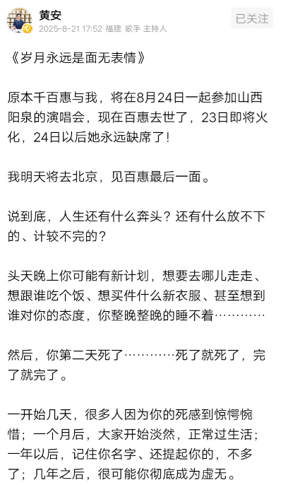 原本8月24日,他们还能在山西阳泉的演唱会上再度相聚,谁料天不遂人愿。8月23日,黄安参加的不是演出,而是老友的丧礼。第二天8月24日,他仍要独自登上阳泉的舞台。
