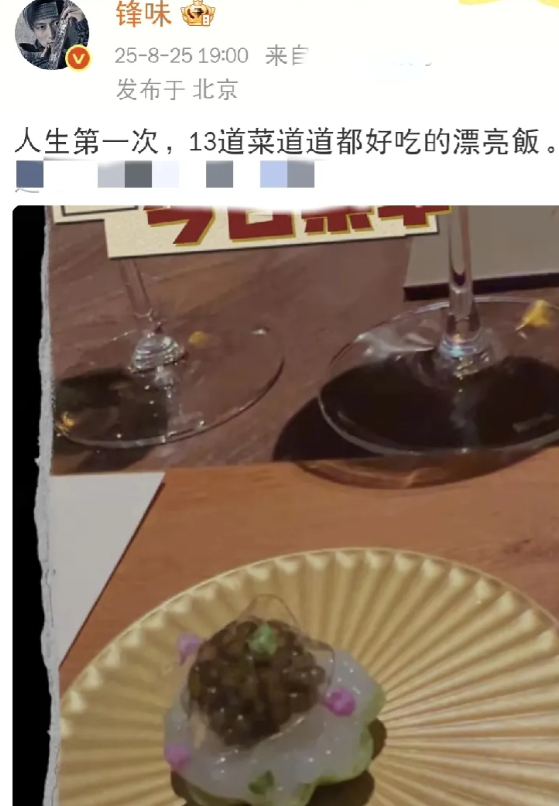 8月25日,谢霆锋在个人社交平台更新动态,激动发文,隔着屏幕都能感受到他的激动,原来,他在某高级餐厅品尝到了一顿令他惊叹不已的完美大餐,谢霆锋激动发文,直言这是“人生第一次,13道菜道道都好吃的漂亮饭”!