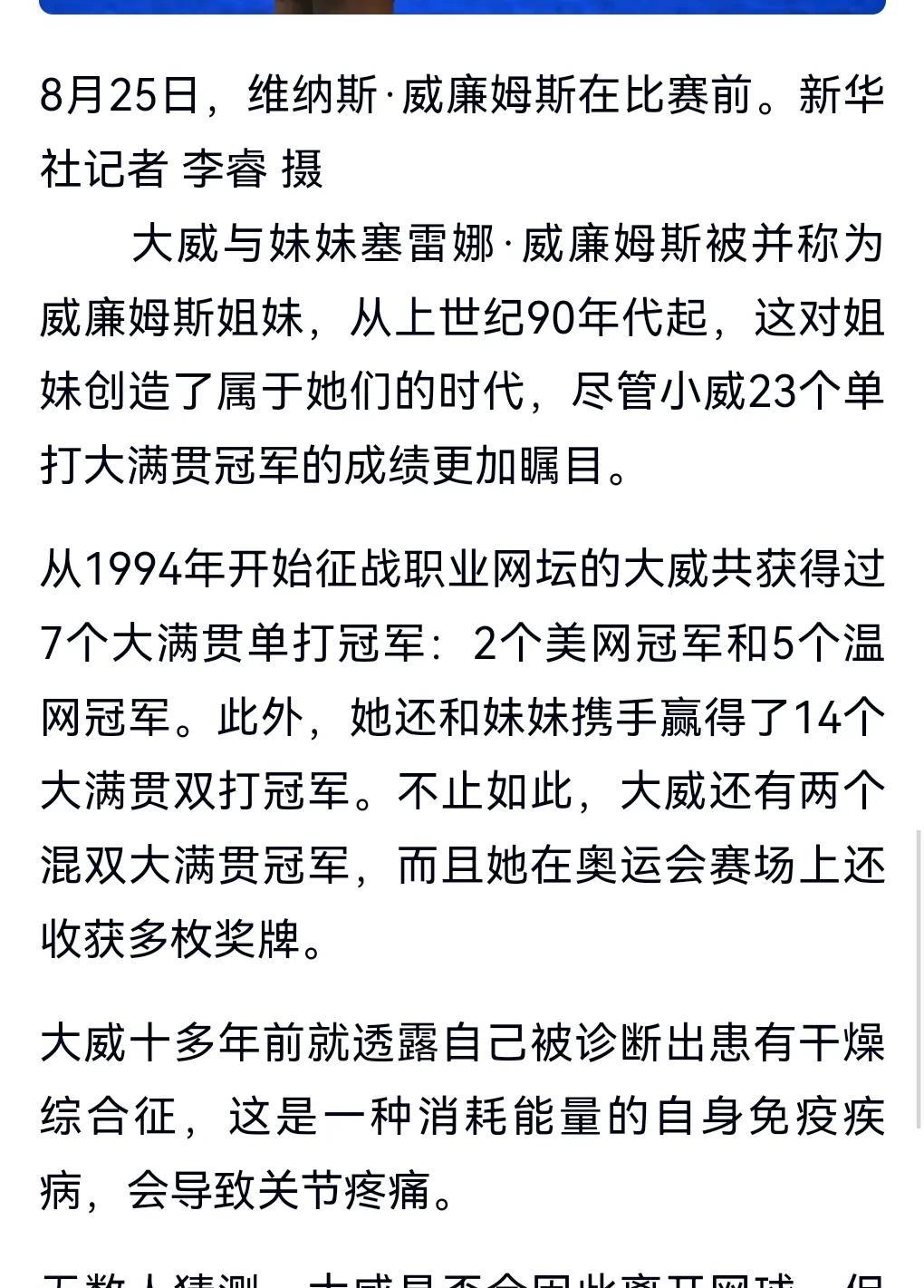 在我的印象中,我的青春时期就经常听到大威的名号,当然还有一个小威。 这对姐妹花当时在网球界那真的是如雷贯耳。 8月26日看到这么个消息。 45岁大威止步美网女单首轮。 可能是年纪太大了,没有往日的体力了,已经很多次止步首轮了。 自2019年进入第二轮以后,大威就没在美网单打比赛中赢过球,往往止步首轮。 #45岁大威止步美网女单首轮#