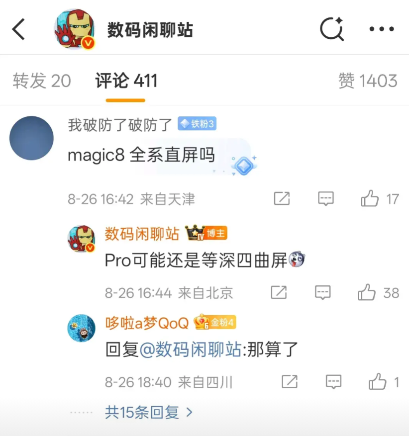 太好了,荣耀Magic8 Pro继续等深微四曲屏,不会改变成直屏,这应该是我继续更换Magic8 Pro的最大动力了。 Mini版和标准版已经确定是直屏了,如果Pro版本也设计成直屏的话,那么Magic8就真的是全系直屏了。 虽然很多人都喜欢直屏,但是我感觉微曲屏的手感要更加的出色,而且我一直都是裸屏使用,也不贴膜,从来不需要考虑曲屏使用什么膜的问题。另外还有至臻版回归的Ultra版本,不出意外的话也会是曲面屏。 其他各大厂商也基本如此,旗舰机型的Pro和Ultra用曲屏,标准版用直屏,希望就这么坚持下去,千万别把Magic8 Pro改成直屏!