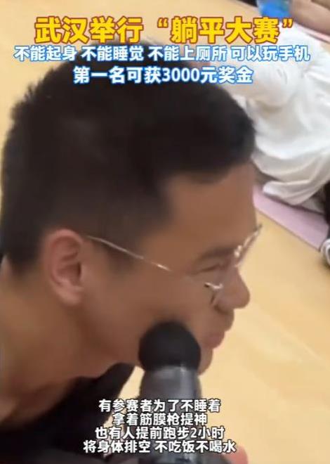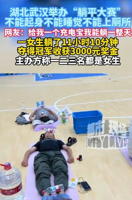“有钱就是任性!”8月24日,武汉,大学举办了一场躺平比赛,冠军能拿3000块,96个学生齐刷刷躺在南苑图书馆前的草坪上,比谁能躺得久。规矩挺特别,不能起身、不能睡觉、连厕所都不能去,但可以玩手机。 武汉一所大学举办了一场躺平为主题的竞赛,引起了社会广泛的关注。 比赛的核心规定是参赛者必须在规定时间内持续躺卧,保持躺姿最久的选手将获得3000元人民币的奖金。 共有96名学生报名参加,比赛设在大学的室内篮球场中。 竞赛当天,气氛十分轻松,比赛开始时学生们纷纷躺在地上,带好了自己的装备。 似乎并不像一场激烈的竞技比赛,反而更像是一群朋友在聚会。 学生们可以带上手机,也没有限制其他的娱乐方式,比如一些参赛者选择玩手机游戏来消磨时间。 为了应对犯困,也有学生带上了筋膜枪来帮助自己进行按摩。 虽然比赛设有3000元的奖金,但许多参赛者表示,他们参加这场比赛并不是为了获得金钱。 而是为了有机会在忙碌的学业和工作压力下,享受一次完全的放松与休息。 赛后的采访中,许多学生分享了自己参与比赛的感受。 一位女学生表示,她平时学业压力很大,周末还需要兼职,经常感到自己不能够好好休息,甚至躺在床上时会有一种浪费时间的负罪感。 但在这场比赛中,她完全放下了负担,躺在地上玩着手机,玩的久了还有可能把钱给赚了。 这种没有压力、没有外界干扰的状态,让她感到身心恢复。 另一位男学生也表示,过去他在玩手机时总觉得自己是在不务正业,但通过这场比赛,他意识到放松和休息并非浪费时间。 随着比赛的逐渐进行,比赛现场的氛围更显放松和友好。 参赛者们之间互相交流,分享一些躺卧的经验和技巧,甚至有参赛者私下递水给旁边的人,大家共同度过这个特殊的下午。 这场“躺平”竞赛很快在网络上传播开来,引发了热烈的讨论。 许多网友在评论中表示支持这场比赛,认为现代社会尤其需要这样一种“理直气壮地放松”的机会。 过去,许多人都将躺平视为懒惰,逃避责任的表现,认为不工作,不奋斗便是一种对社会的不负责任。 而如今,这场比赛却将躺平作为一种有价值的行为进行提倡,让学生们休息的心安理得。 有人指出,比赛本身并非仅仅是关于谁能坚持最长时间,而是通过这种特殊的方式,传递了一个重要的信息。 累了就应该休息,这并非什么羞耻的行为,而是人的基本需求。 比赛在晚上的十一点多结束,没想到前三名都是女生,甚至第一名坚持了11个小时。 如果让你去,你能坚持多久? 信源:都市现场