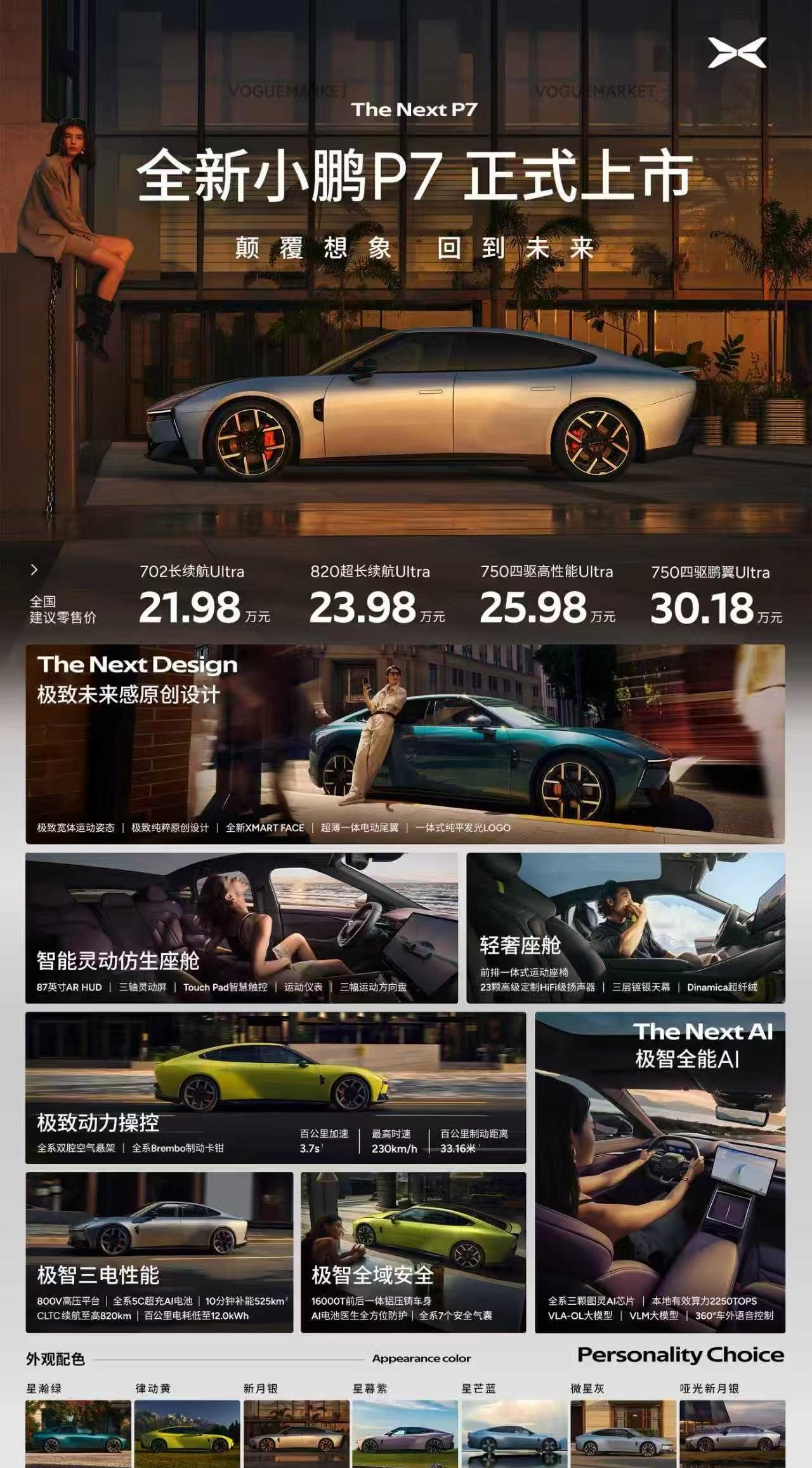 小鹏全新 P7 价格来啦!鹏神价格啊,关键是标配很多。20多万纯电轿车的“圈子”乱了,你觉得P7最先把谁的销量打下来? 702 长续航 Ultra 版本:21.98 万元 续航 702 km 74.9 度磷酸铁锂电池 367 马力单电机后驱 820 超长续航 Ultra 版:23.98 万 续航 820 km 92.2 度三元锂电池 367 马力单电机后驱 750 四驱高性能 Ultra 版本:25.98 万 续航 750 km 92.2 度三元锂电池 593 马力双电机四驱 750四驱剪刀门版:30.18万(负责情绪价值) 全系标配 3颗 图灵芯片,双腔空悬+CDC,7.1.4 音响,前245/后275鸳鸯胎、布雷博四活塞固定卡钳等等(具体见图) 这回纯电轿车要重新洗牌了,小鹏啊真是从MONA M03上找到了定价密码。【来自懂车帝车友圈】