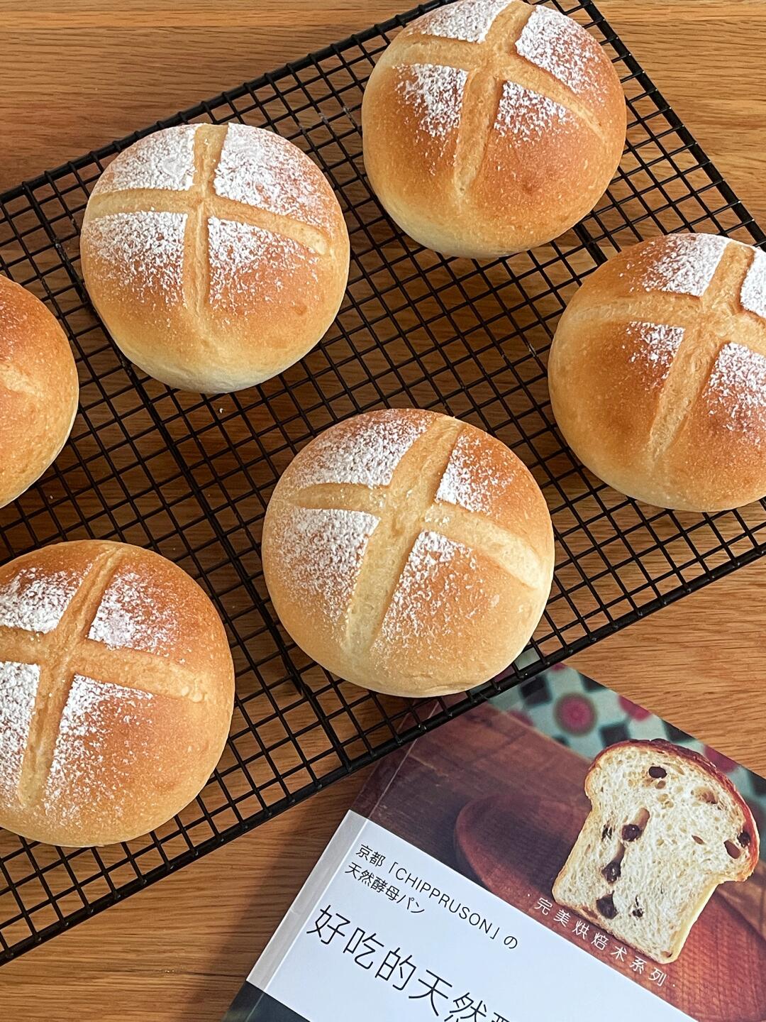 5⃣️发酵好的面团,撒上高粉,表面浅🈹️十字