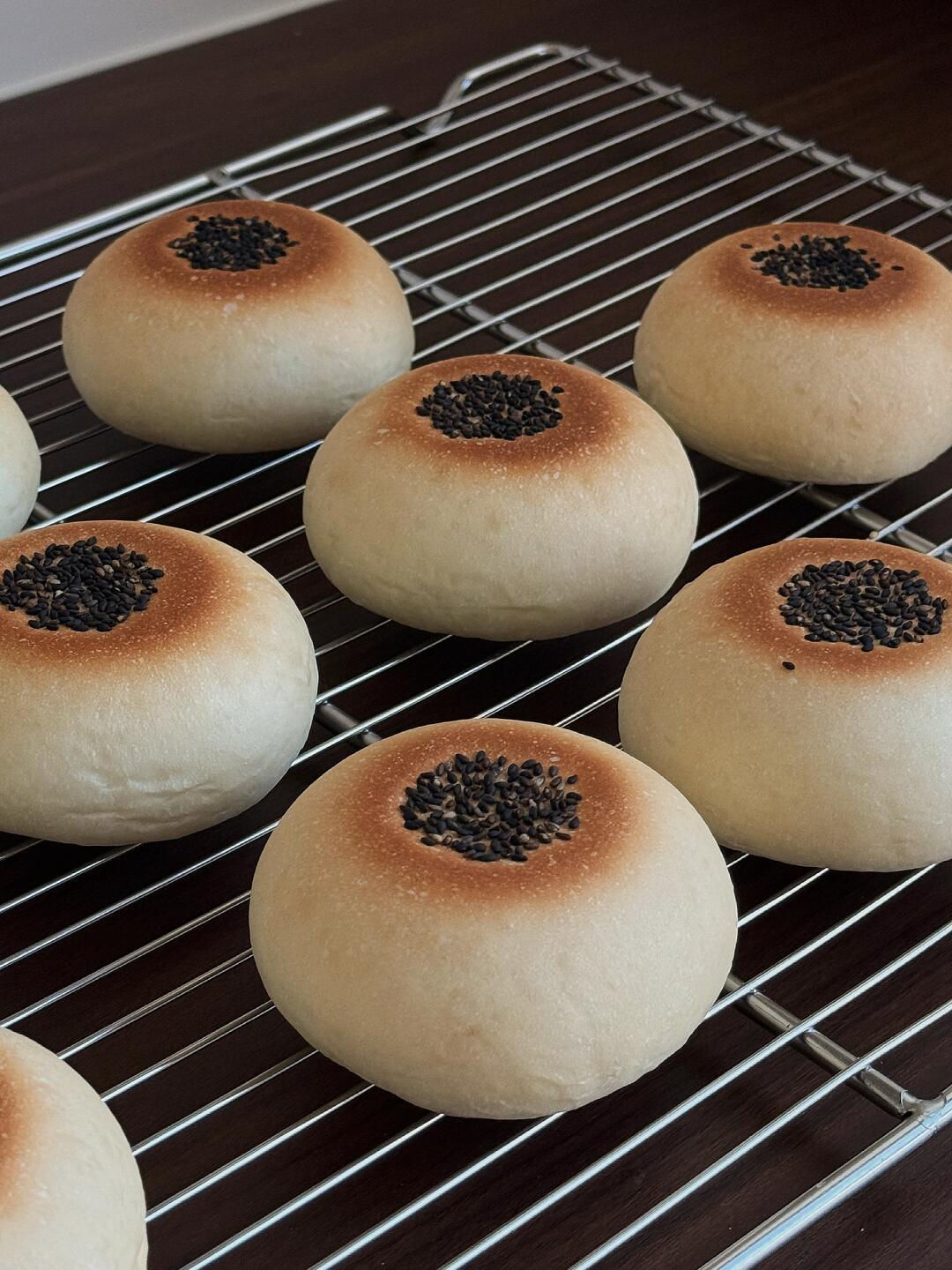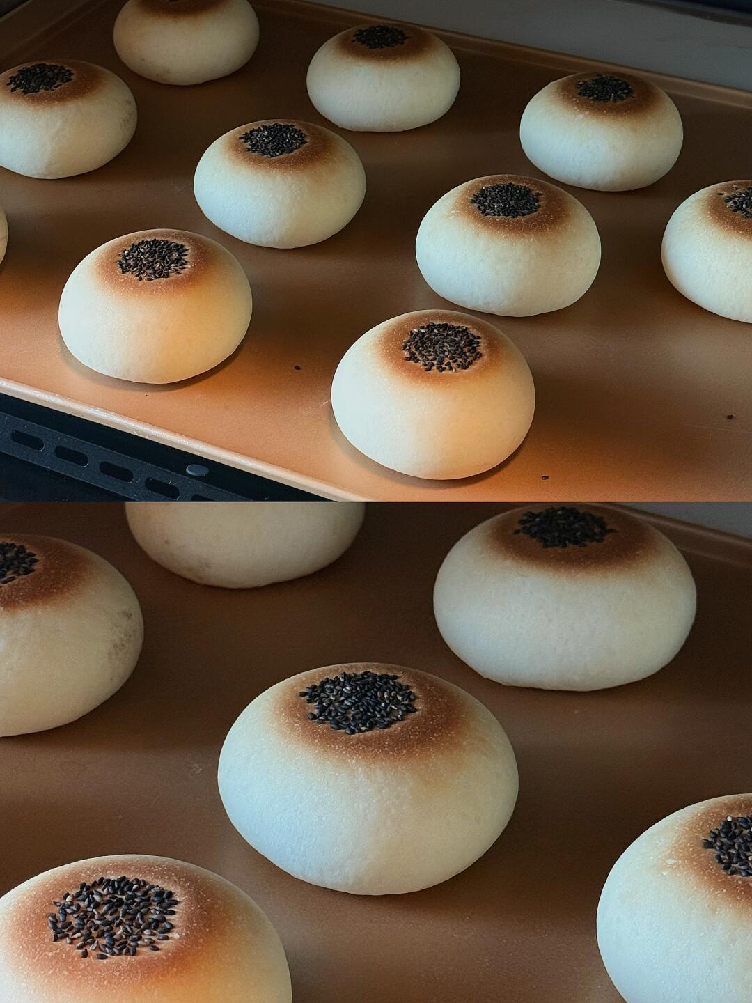 7️⃣发酵好借助擀面杖沾水装饰上熟芝麻,送入烤箱