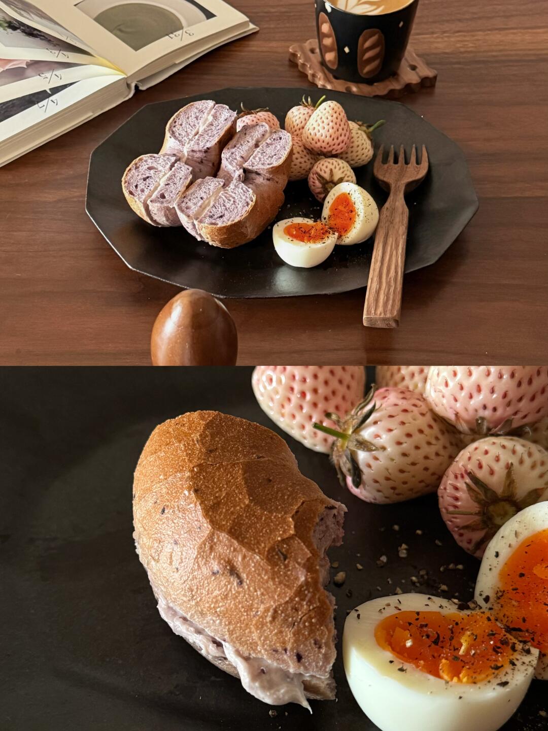脆韧的面包体,我用奶酪混合蓝莓酱厚抹在中间