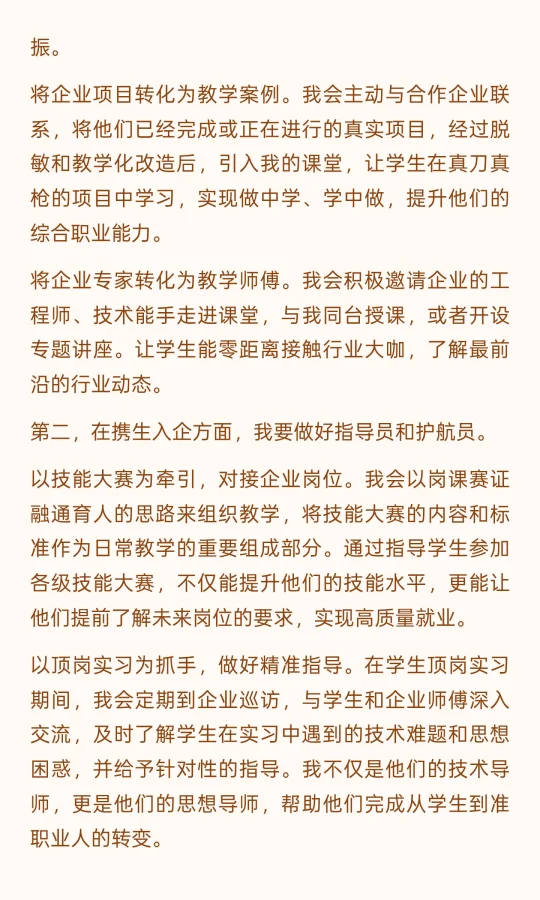 作为教师,我通过“引企入教”和“携生入企”推动产教融合。在“引企入教”中,我将企业标准、项目和专家引入课堂,确保教学与产业需求同步。在“携生入企”中,我指导学生参加技能大赛和顶岗实习,帮助他们提前适应岗位需求,实现高质量就业。
