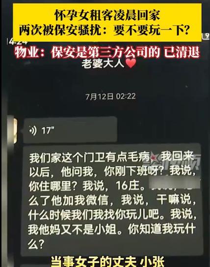 近日报道,浙江杭州,一孕妇穿着短裙凌晨2点多回家,小区保安看到后跑出来问她,要不要玩一下?女子气够呛,过了2天,女子再次后半夜回家时,保安又追出来问,美女要不要玩一下?女子急忙拿出手机录像,骂了他几句。而女子老公气的报警,要求开除保安,物业满口答应,结果老公却发现,保安还在当值,一点事都没有! 第二天小张就向物业投诉,物业表示已保留监控但声称“没有声音”,并初步认为两人可能相识。 对于这个说法,一些网友并不买单,毕竟一位孕妇在自家小区内连续两次受到保安骚扰,而本该提供安全保护的角色却演变成了威胁源,这明显有道德问题。甚至这件事让其余女性夜间出行的安全感大打折扣,不得不时刻保持警惕。 然而事情并没有结束,仅仅两天后,当小张妻子又一次在后半夜回家时,同一个保安竟然直接冲出保安亭,重复着那句“美女,要不要玩一下”,并追赶着她。惊恐中,她急忙掏出手机录像并厉声斥责,才趁机脱身跑回家中。 身为丈夫的小张感到既愤怒又担忧,毕竟妻子怀有身孕,凌晨时分在自家小区受到这样的惊吓,万一发生意外后果不堪设想。他立即报警,并与物业、保安进行了三方协商,最终达成共识:7月底前开除这名保安。 但承诺并未如期兑现,到了7月底,保安仍在岗位;物业以“缺人”为由要求再等几天;直到8月10日,小张发现那名保安依然在岗。直到媒体介入后,物业才最终确认该保安已被清退,并解释称保安属于“第三方公司”。 从这件事中我们可以看到,物业管理肯定是存在明显的责任缺失,即使保安来自第三方公司,物业也是有责任确保所有工作人员遵守职业道德。但在此事件中,物业初期试图以“可能认识”为由淡化事件严重性,事后又拖延履行开除承诺。 更令人担忧的是,很多人可能会轻描淡写地认为“只是一句话”,却忽视了这种行为对受害者造成的心理创伤和安全威胁。尤其是孕妇等特殊群体,在受到惊吓后可能面临更严重的健康风险。 这起事件最终以保安被清退告一段落,但留给我们的思考远未结束。我们需要认识到:任何形式的性骚扰都绝不是“玩笑”,而是对他人尊严和安全侵犯,并且我们需要支持受害者勇敢维权,而不是让她们感到羞耻或恐惧。 尤其在我们日益关注公共安全的今天,每个人都应该能够在自己的社区中感到安全,而不是在回家路上提心吊胆。 信息来源: 潇湘晨报丨《浙江一怀孕女子凌晨回家遭保安骚扰!物业:保安是第三方公司的,已清退》 文丨小王 编辑丨史叔