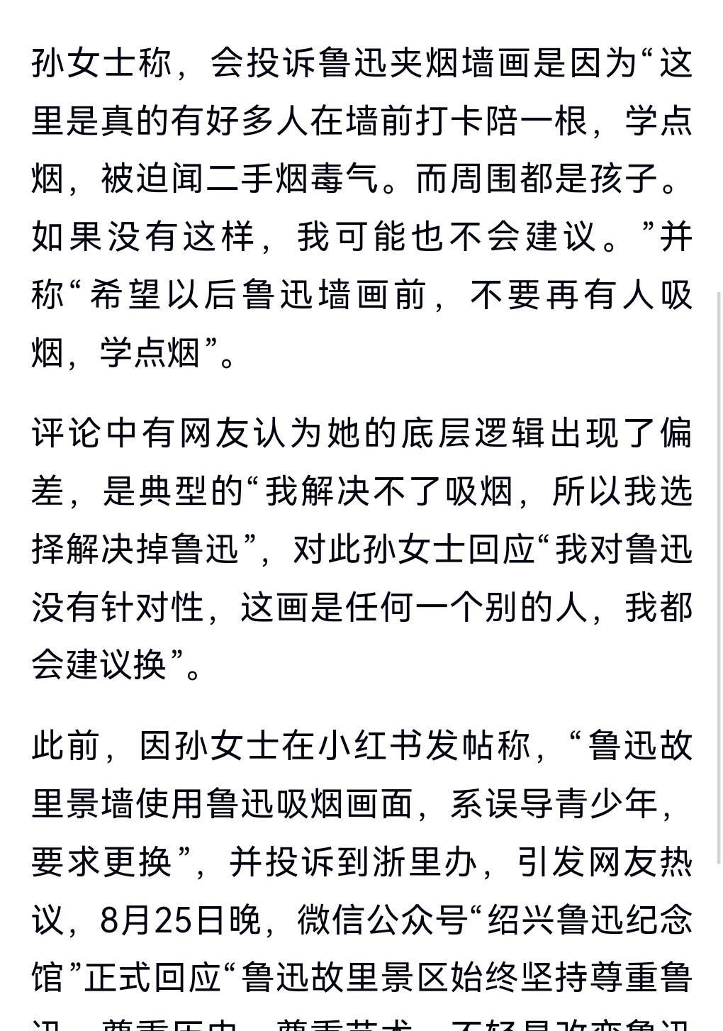近日一女子投诉鲁迅抽烟墙画误导青少年吸烟。 不过网友们铺天盖地的指责女子。 鲁迅的抽烟墙画并没有错,错的是那些玩梗的人,很多人在打卡点拍那个抽烟的视频上传到网上玩梗。 这些玩梗也是不尊重鲁迅的行为。 8月30日在网上看到一消息。 8月28日,投诉鲁迅抽烟墙画当事人致歉。