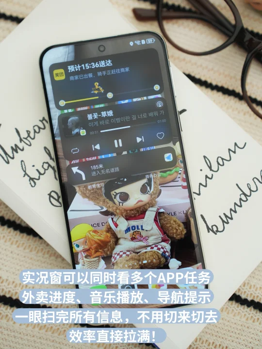 日常使用也很贴心,实况窗可以显示外卖进度、听歌和导航,不用来回切换APP,一眼就能看到所有状态。