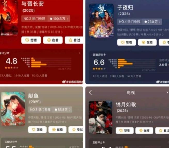 宋轶和丞磊的《与晋长安》豆瓣评分4.8 没想到这部剧评分这么差,毕竟是邓科的作品呀,前几部古装剧可都是高集均,高热度,高评分,但是这部《与晋长安》破万无望了,集均估计可能不到2000万,评分也很低,暑期档最后对打的四部古偶,评分都在4-6之间。