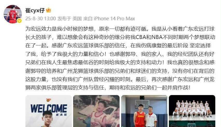 实现儿时的梦想!崔永熙终于穿上了梦寐以求的宏远战袍 崔永熙转会广东队,估计很多球迷都早有预料,毕竟崔永熙的启蒙恩师李群就是广东队出去的,这些年李群的篮球学校也一直是广东队的人才基地,崔永熙当初的最佳去处也是广东队,但是郭指导亲自去找李群,并且承诺重点培养,李群也是站在球员自身成长的角度,让崔永熙加盟了广州队。 看看郭指导对于崔永熙的培养确实是非常成功的,新秀赛季进入国家队,二年级打进NBA,现在更是顶薪加盟广东队,如果崔永熙一直在广东队不要说顶薪,现在能不能在广东队站稳脚跟都是个问题,球队太强对于年轻球员来说确实不是好事,毕竟意味着竞争对手更强,也意味着球队要追求战绩根本不会花太多时间去培养年轻球员。 崔永熙加盟广东队其实也算是实现了儿时的梦想,他从小就看广东队比赛,他在发表离队感言的时候,不仅感谢了郭指导的培养,还配上了自己儿时身穿宏远战袍的照片,这次他终于穿上了梦寐以求的宏远战袍。