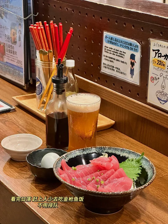 ✅19:20一般日落结束后,大家就坐上公交回家了,但是我正好不用排队 ,吃上親父のまぐろ家的生枪鱼饭 ,小份60r 1280日元,一边吃生鱼饭,一边等蓝调(他们家就在海边,20:30关门)