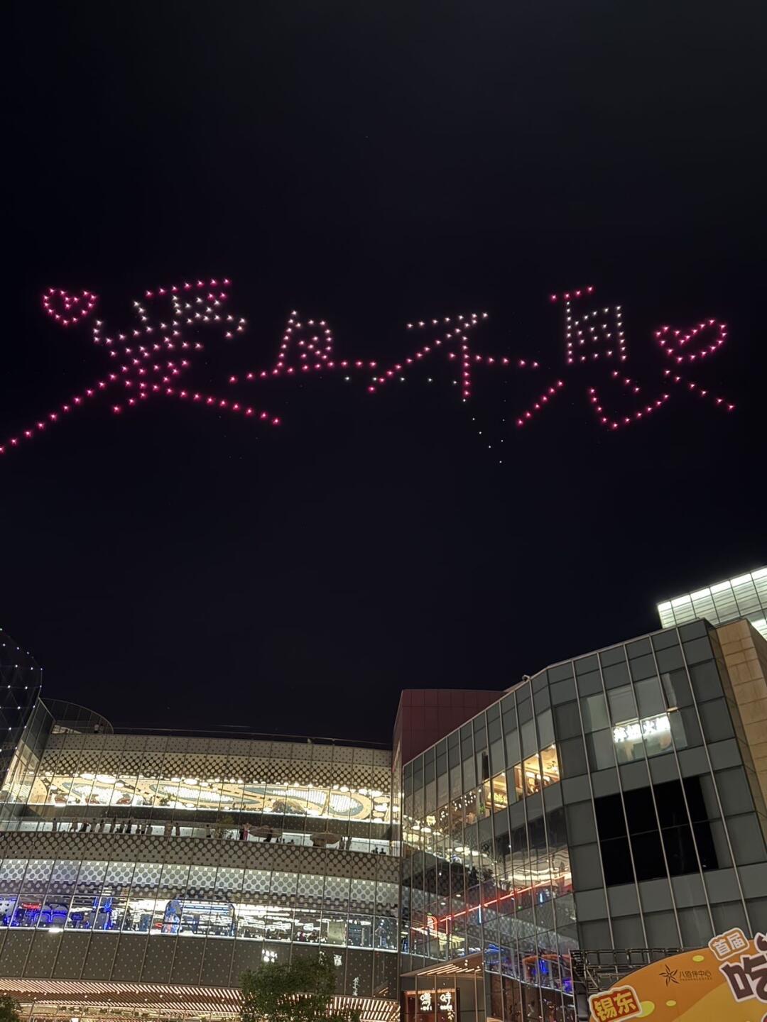 爱心、鹊桥、“七夕快乐”在夜空中轮番变换