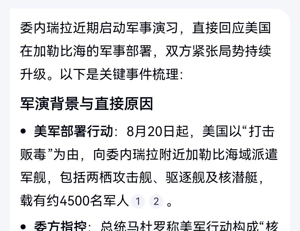 美国又在搞事情了。 近日竟然在委内瑞拉海域附近部署军舰和士兵。 打着打击毒品的旗号。 美国的行为真是让人防不胜防。 委内瑞拉确实要做好准备了。 委内瑞拉举行军演应对美军舰威胁。 这也真是敲响了警钟。一个国家如果不够强大那就有可能被别人消灭掉。