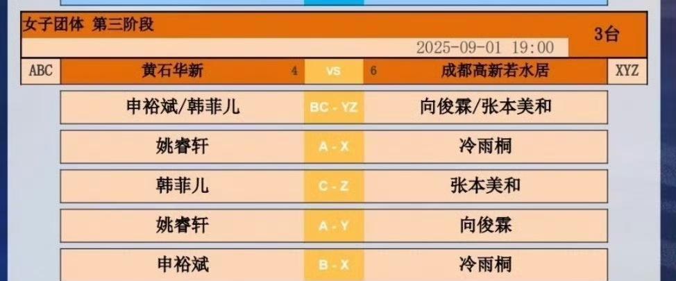 2025年乒超联赛第三阶段女子团体对阵表: 黄石华新VS成都高新若水居 三号台 申裕斌韩菲儿VS向俊霖张本美和 姚睿轩VS冷雨桐 韩菲儿VS张本美和 姚睿轩VS向俊霖