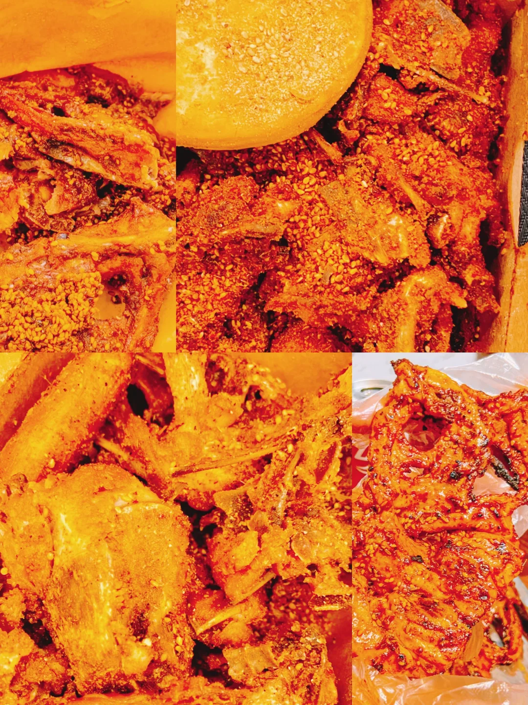 [拔草R]操作:将调料依次加入鸡架中,搅拌均匀,让鸡架每一处都沾上调料。粉类调料比较多,如果偏干,可以加入少量清水搅拌,让调料充分融化,能让鸡架更好的入味。