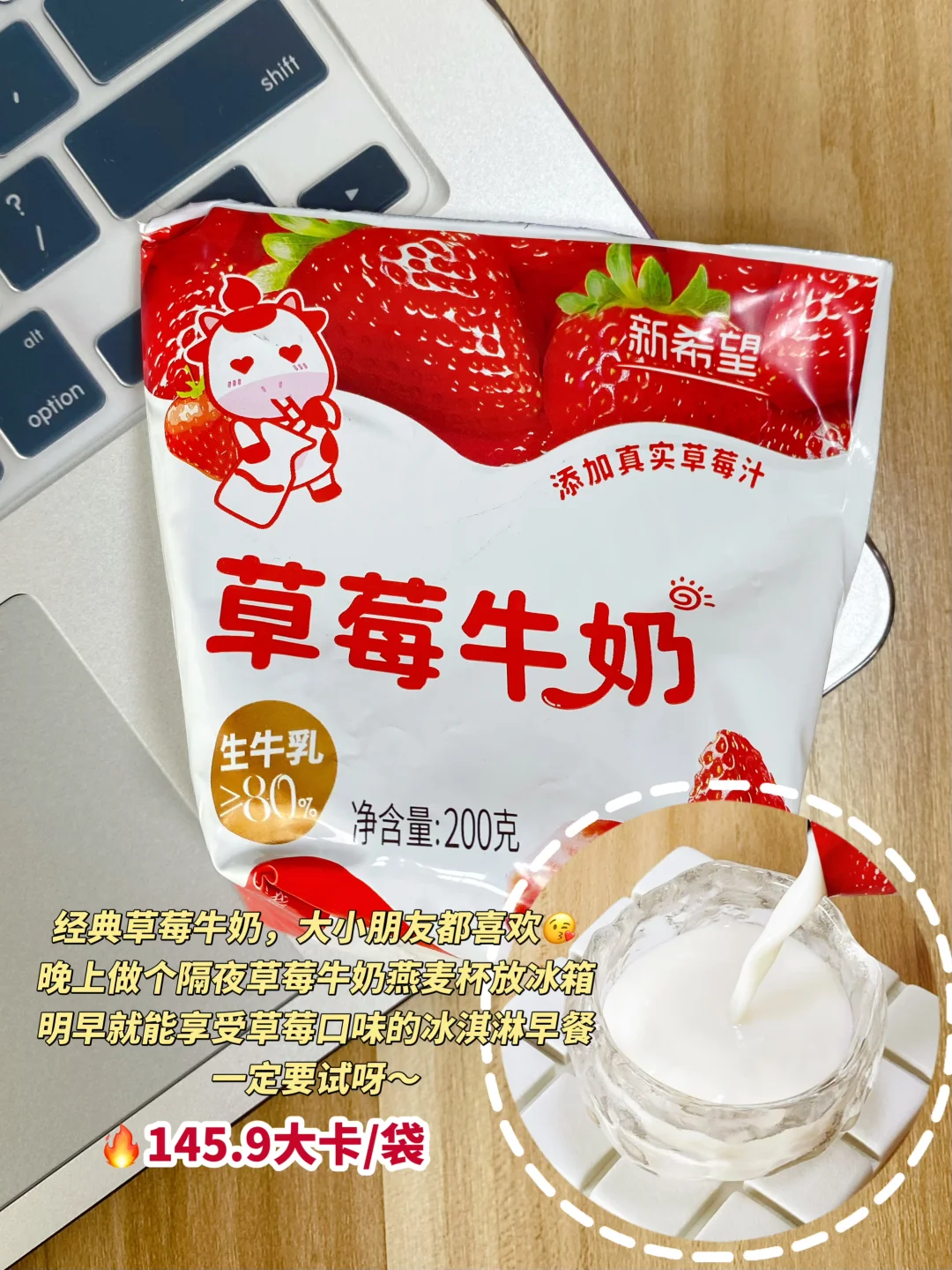🍓草莓牛奶:经典草莓牛奶,大小朋友都喜欢。晚上做个草莓牛奶燕麦杯,隔天的早餐真的是有颜又有甜。