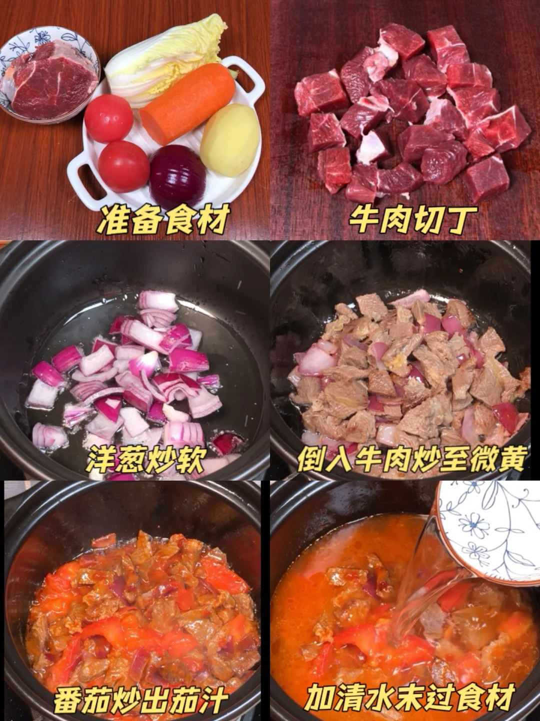 2️⃣锅热倒油,放入洋葱炒香炒软,接着倒入牛粒翻炒变色至微微金黄,接着倒入番茄和2勺番茄酱,炒软炒出汁水、加清水末过食材,大火煮沸后转小火炖40分钟