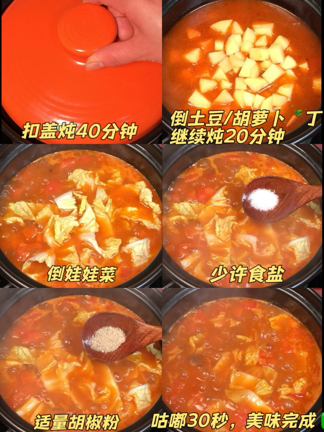 3️⃣加土豆和胡萝卜粒继续煮个20分钟,倒入娃娃菜,调味放少许食盐,胡椒粉适量,咕嘟个5、6、7、8下即可出锅啦!