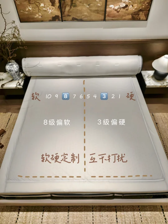 更难得的是,这张床垫按照我和家人的身形,经AI检测,分区定制软硬—— 我这一侧偏柔,八级绵软,不陷不塌,包裹之中犹有支撑,腰臀腿颈皆被温柔承托。晨起时,再也没有腰酸背疼的感觉.
