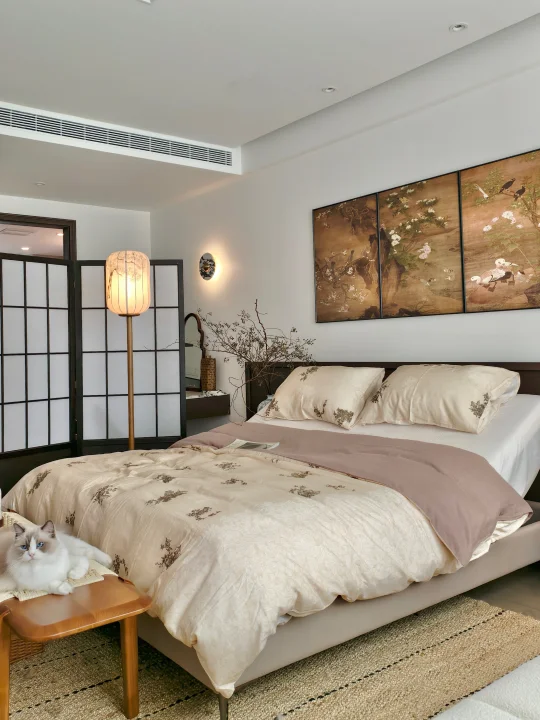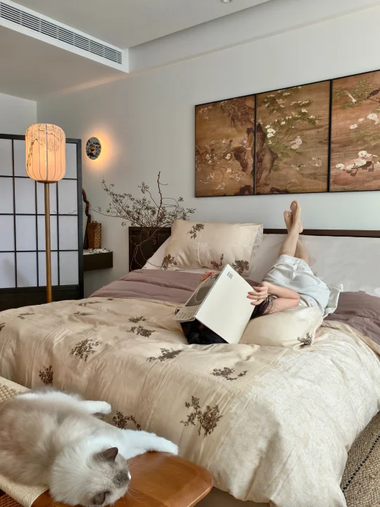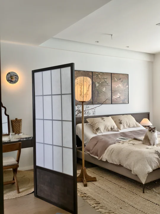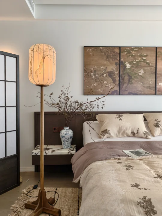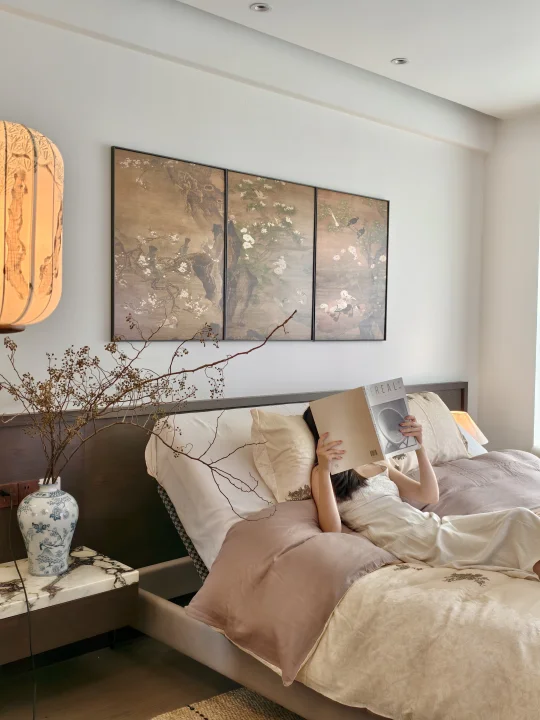 借鉴了宋人雅致审美的一些装饰心得,把这间精装房交付的卧室,渐渐改造成一方带有禅意的居所。布置清单有:青花瓷、屏风、山归来、四季花鸟图、宫灯……