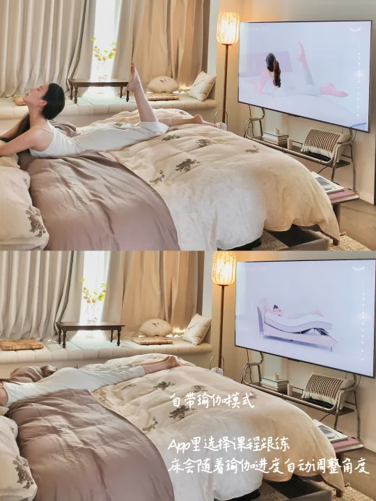 看倦了,不妨舒展身体,尝试「瑜伽模式」 内置多种APP课程,床会随着进度同步智能调整角度,仿佛私人教练伴于身侧,修养身心亦如隐居.